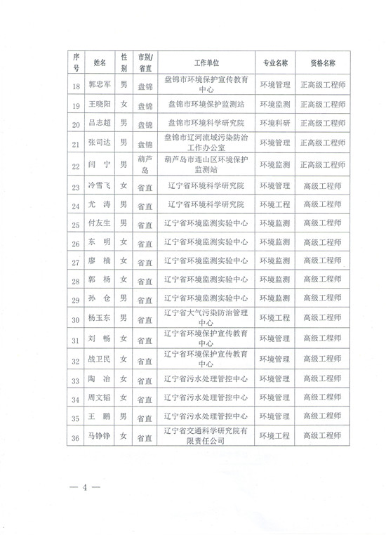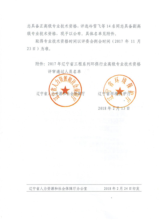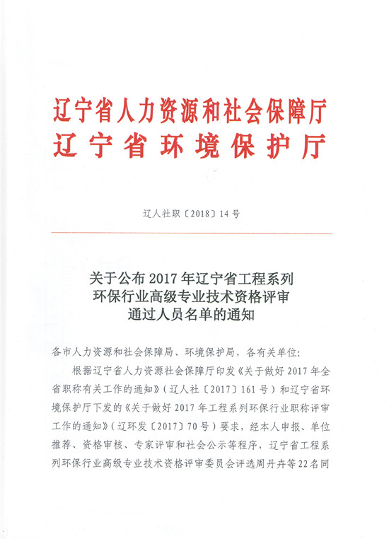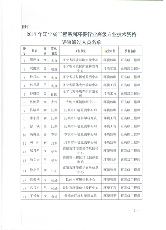 关于公布2017年辽宁省工程系列环保行业高级专业技术资格评审通过人员名单的通知
