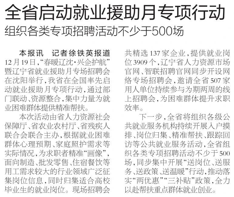 本报讯记者徐铁英报道12月19日,“春暖辽沈·兴企护航”暨辽宁省就业援助月专场招聘会在沈阳举行,我省在全国率先启动就业援助月专项行动,通过部门联动、资源整合,集中力量为就业困难群体提供精准帮扶。