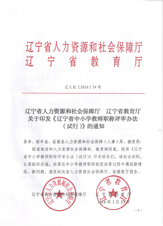 辽宁省人力资源和社会保障厅 辽宁省教育厅关于印发《辽宁省中小学教师职称评审办法(试行)》的通知