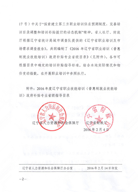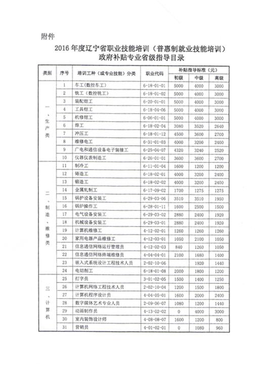 关于印发《2016年辽宁省职业培训(普惠制就业技能培训)政府补贴专业省级指导目录》的通知
