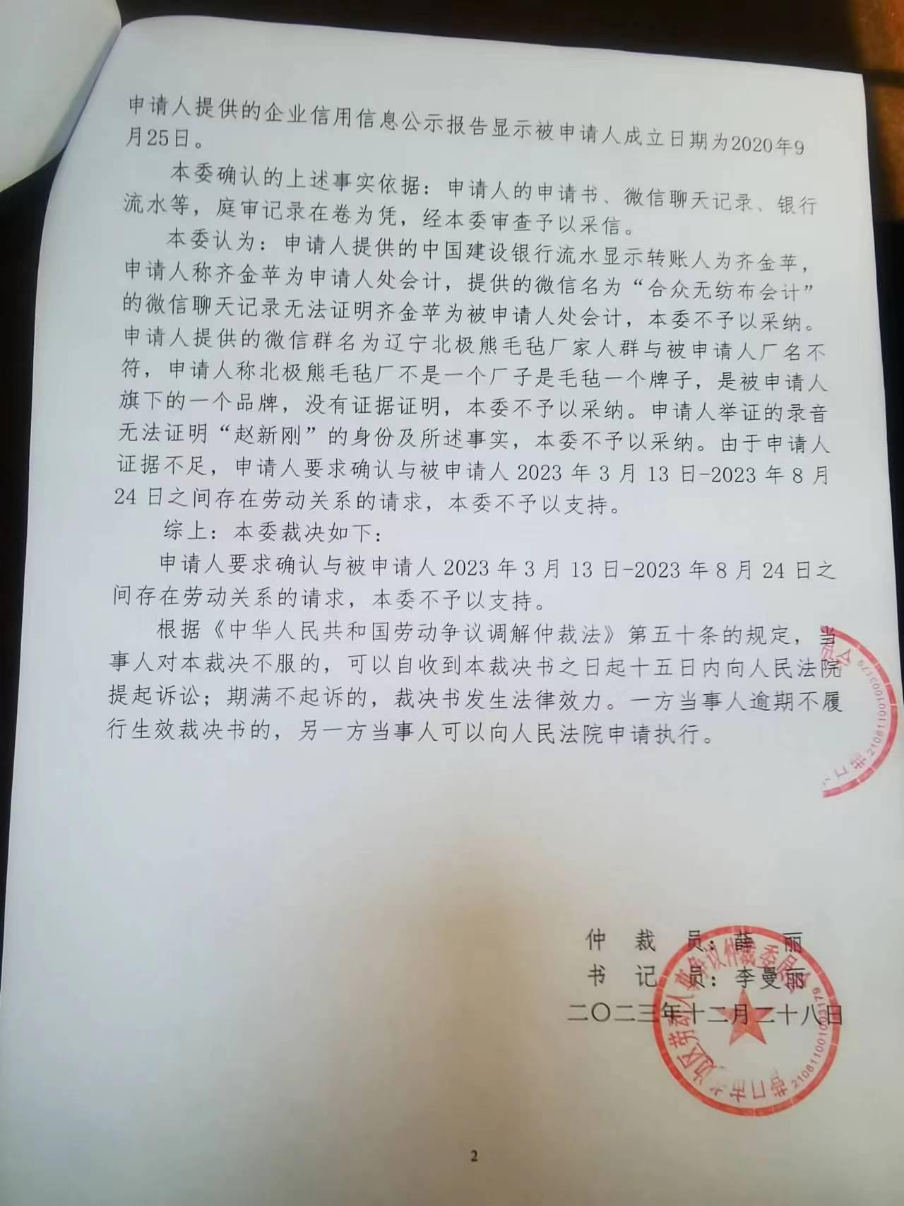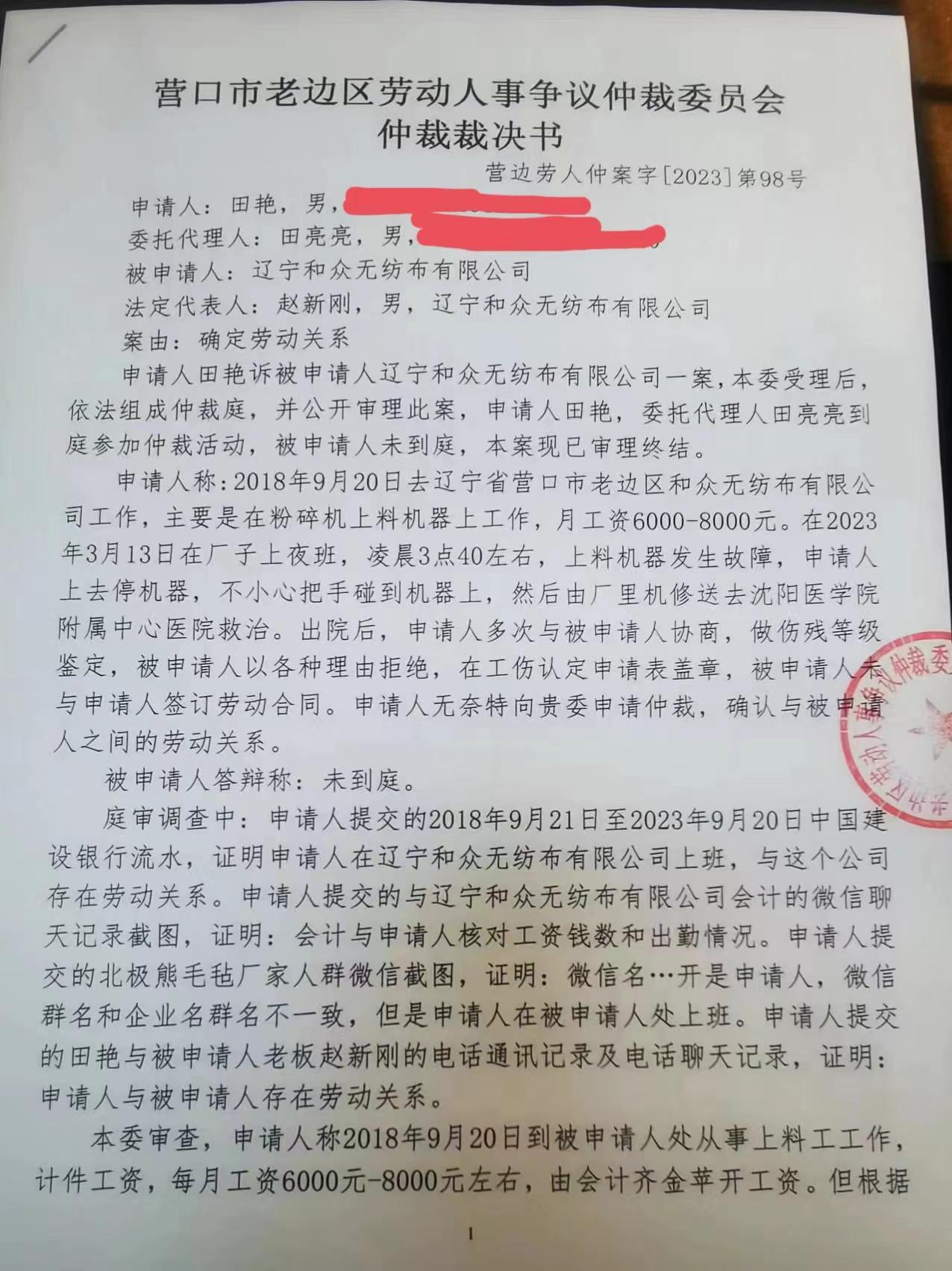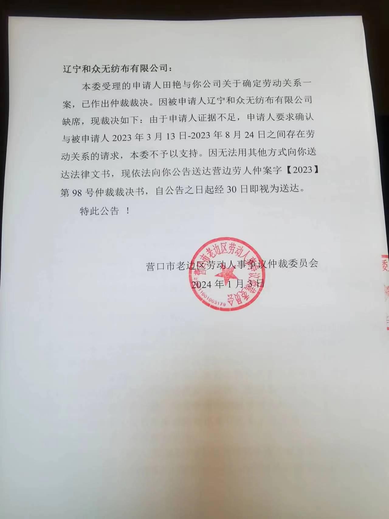 本委受理的申请人田艳与你公司关于确定劳动关系一案,已作出仲裁裁决。因被申请人辽宁和众无纺布有限公司缺席,现裁决如下: