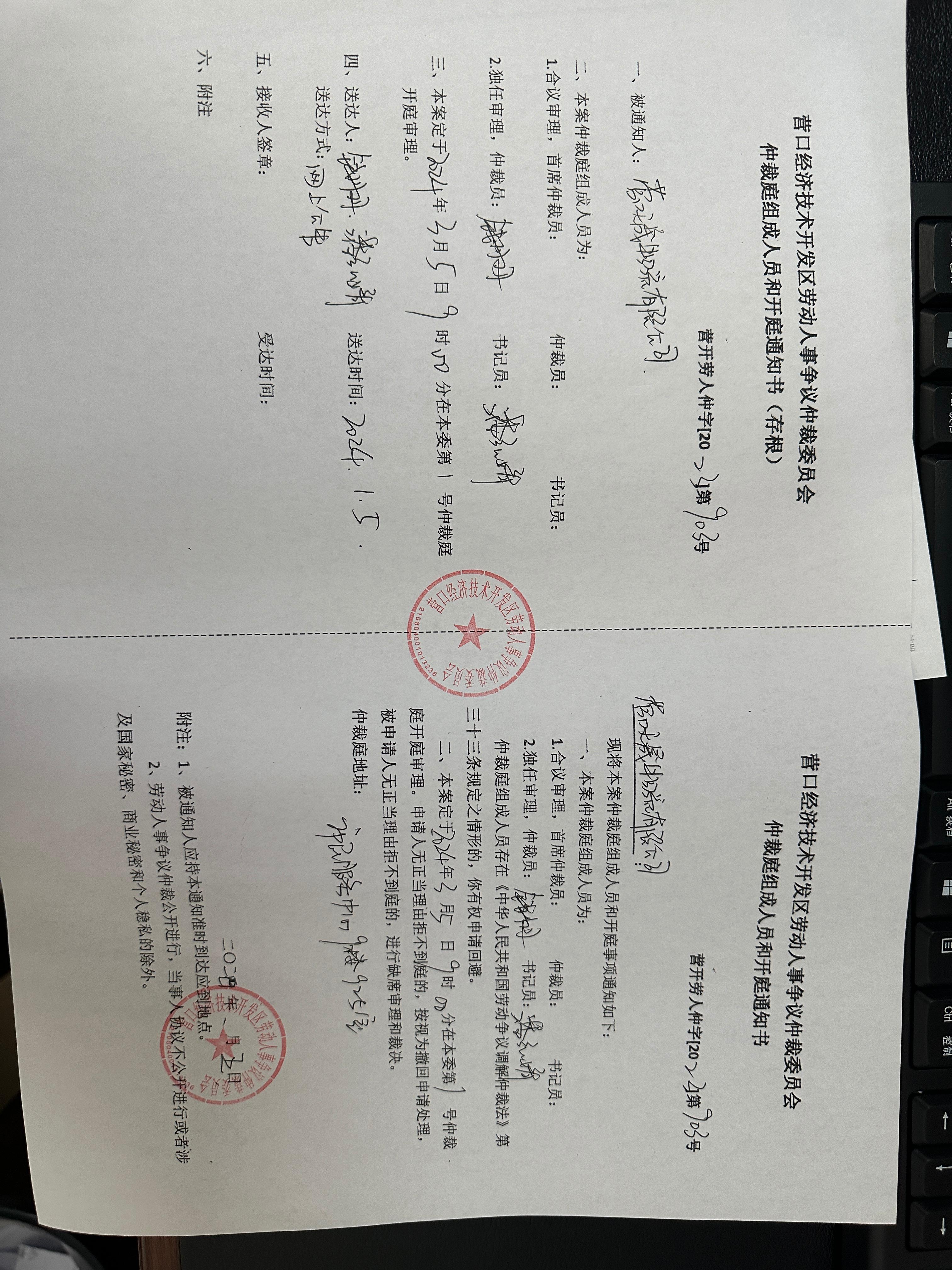 本委定于2024年3月5日9时在本委第一仲裁庭(地址:营口经济技术开发区市民服务中心925室)公开开庭审理,请准时参加庭审,否则本委将依法缺席裁决。领取裁决书的期限为闭庭后的10日内,逾期不领即视为送达。