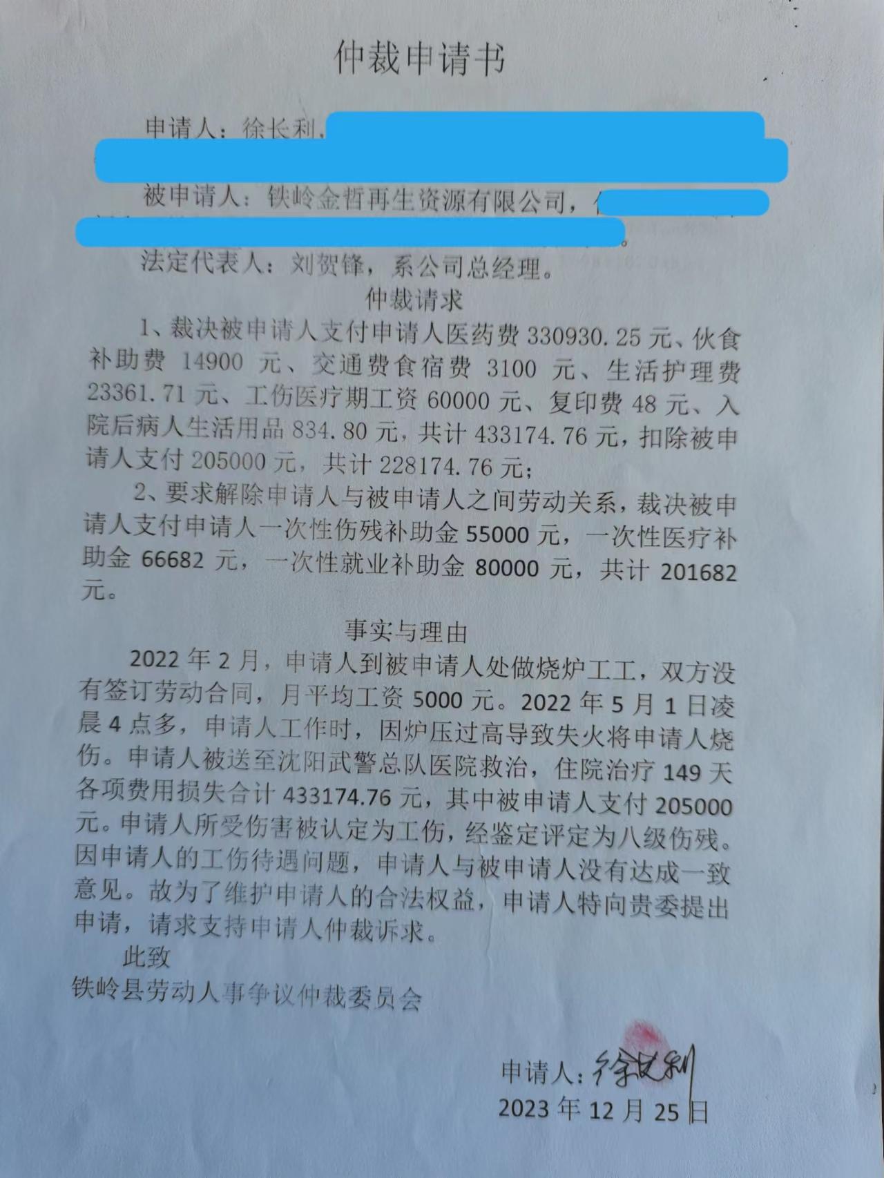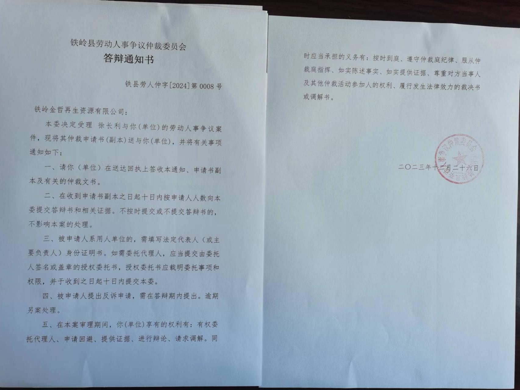 本委已受理徐长利诉你单位工伤待遇争议案件(铁县劳人仲字〔2024〕第0008号),因用其他方式无法向你单位送达法律文书,现依法向你单位公告送达仲裁申请书(副本)、答辩通知书、答辩书、法定代表人身份证明书、授权委托书、举证通知书、证据清单、仲裁庭组成人员和开庭通知书。上述法律文书自本公告发布之日起经30日即视为送达。提交答辩状和证据的期限为公告送达期满后10日内。