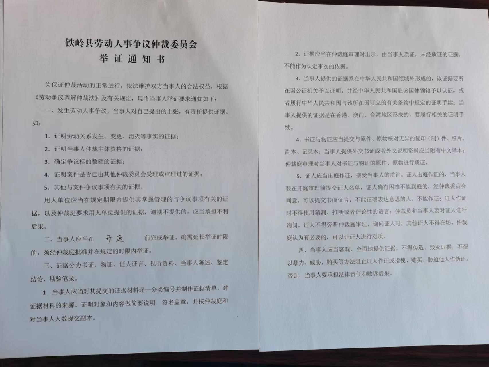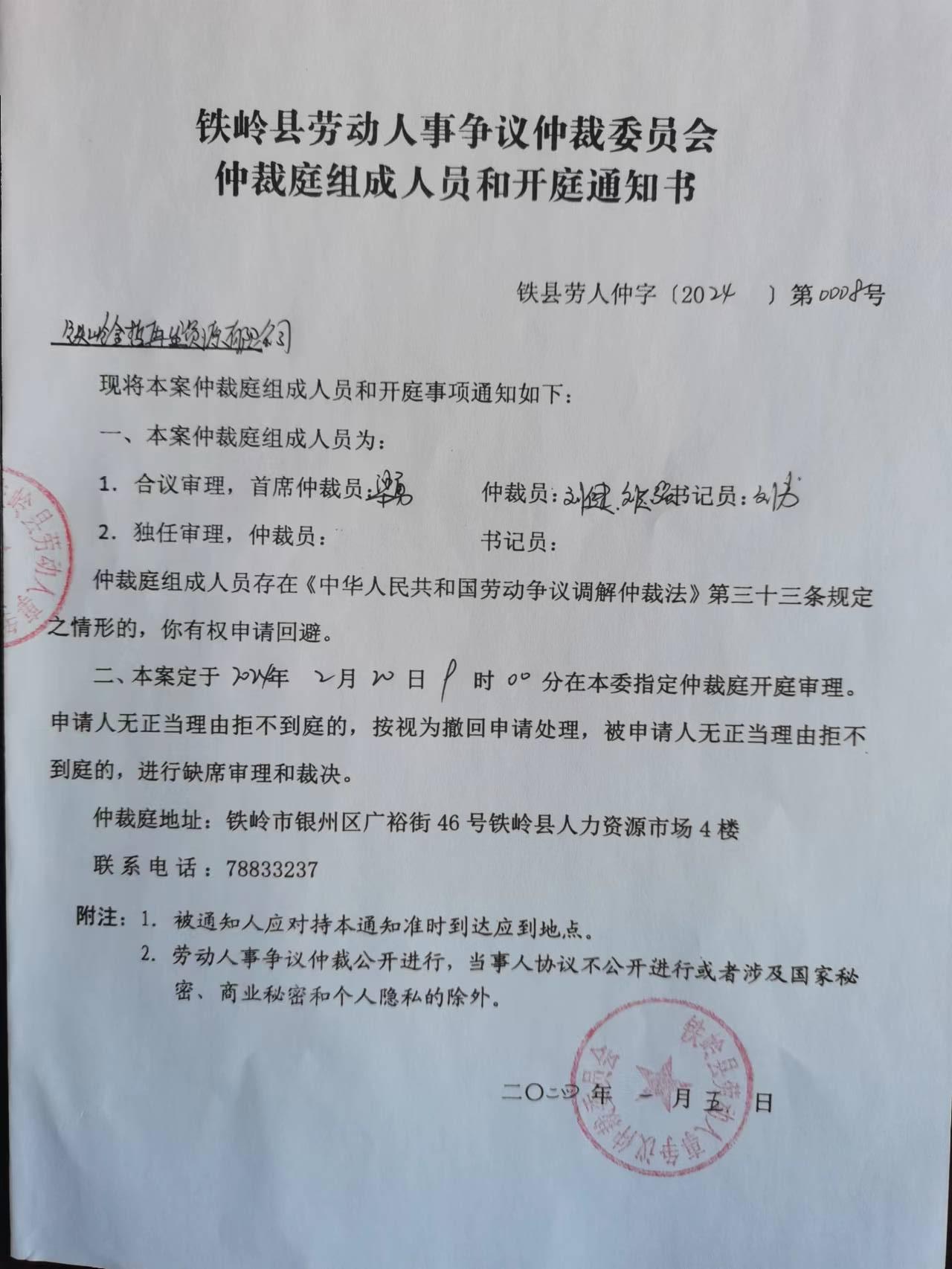 本委定于2024年2月20日9时00分在铁岭市银州区广裕街46号(铁岭县人力资源市场)4楼仲裁庭开庭审理。无正当理由拒不到庭或者未经仲裁庭允许中途退庭的,本委将依法缺席裁决。