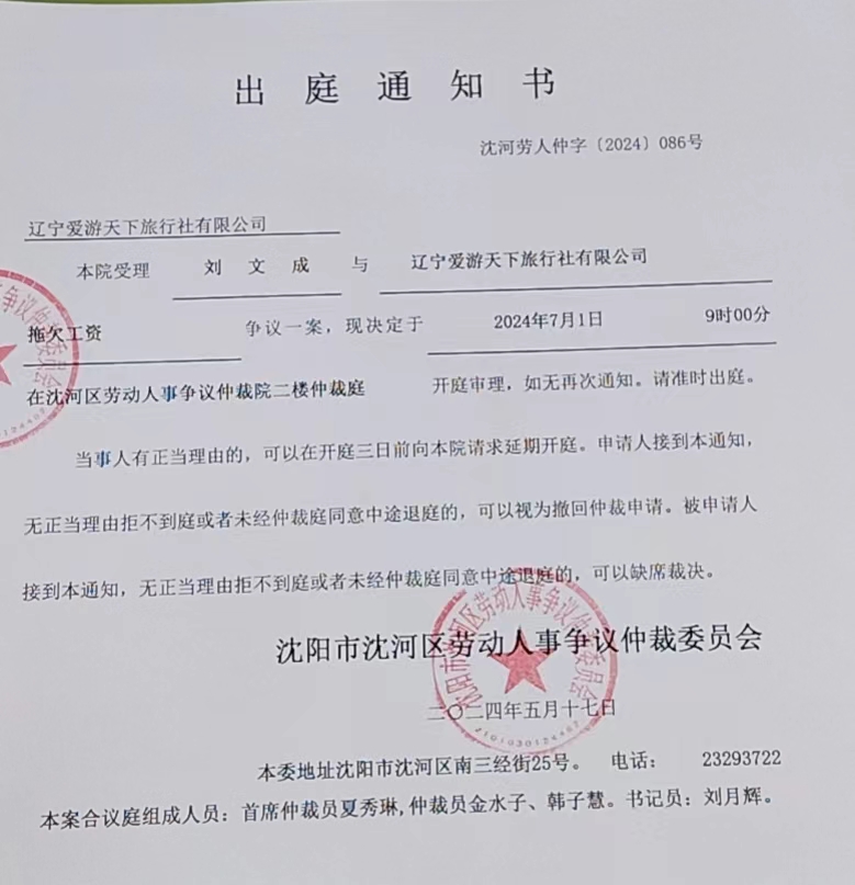 本委定于2024年7月1日9时00分在沈阳市沈河区南三经街25号,沈河区劳动人事争议仲裁委员会二楼仲裁庭开庭审理。届时不到庭,本委将依法缺席裁决。