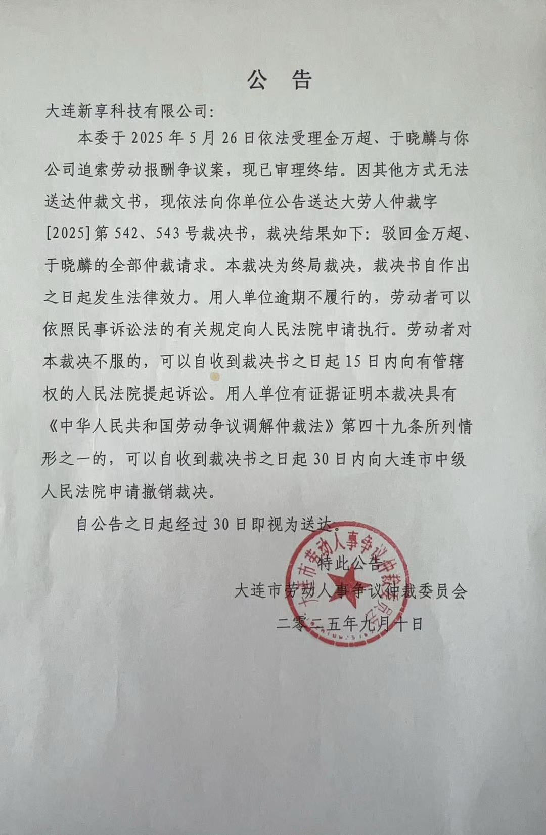 本委于2025年5月26日依法受理金万超、于晓麟与你公司追索劳动报酬争议案,现已审理终结。因其他方式无法送达仲裁文书,现依法向你单位公告送达大劳人仲裁字〔2025〕第542、543号裁决书,裁决结果如下: