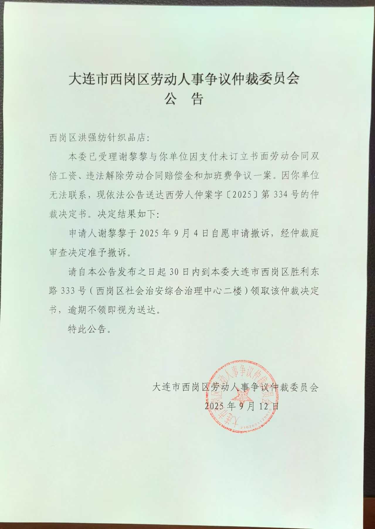 请自本公告发布之日起30日内到本委大连市西岗区胜利东路333号(西岗区社会治安综合治理中心二楼)领取该仲裁决定书,逾期不领即视为送达。