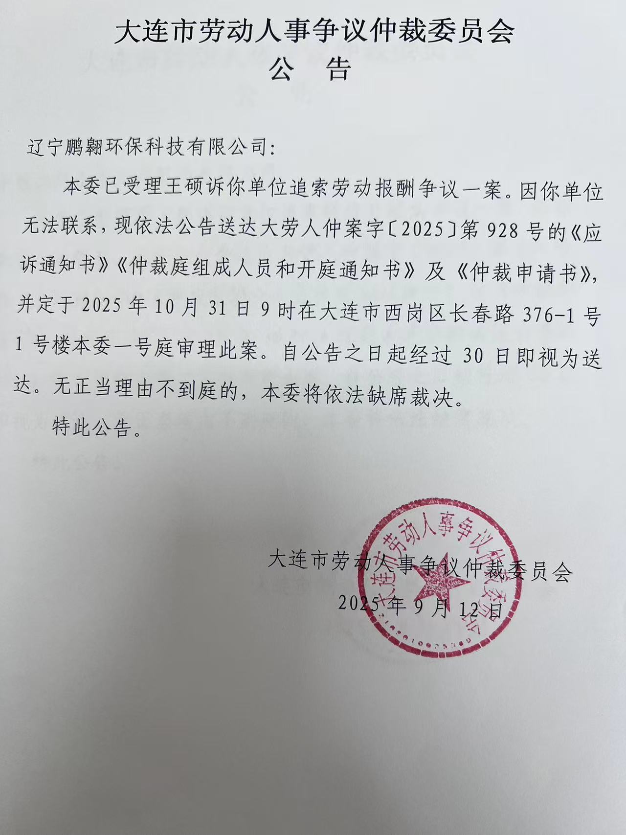 本委已受理王硕诉你单位追索劳动报酬争议一案。因你单位无法联系,现依法公告送达大劳人仲案字〔2025〕第928号的《应诉通知书》《仲裁庭组成人员和开庭通知书》及《仲裁申请书》,并定于2025年10月31日9时在大连市西岗区长春路376-1号1号楼本委一号庭审理此案。自公告之日起经过30日即视为送达。无正当理由不到庭的,本委将依法缺席裁决。