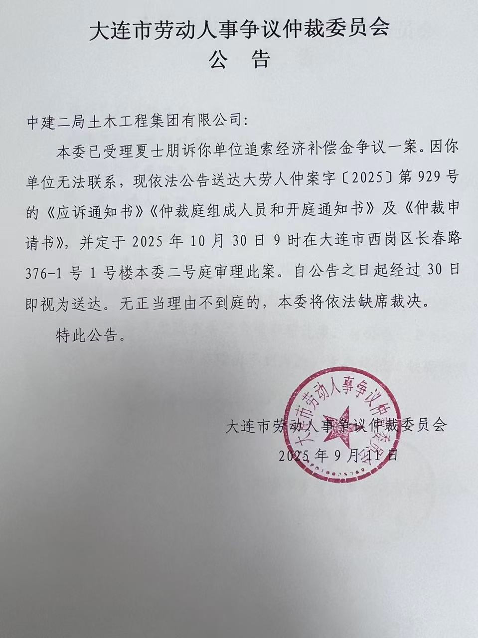 本委已受理夏士朋诉你单位追索经济补偿金争议一案。因你单位无法联系,现依法公告送达大劳人仲案字〔2025〕第929号的《应诉通知书》《仲裁庭组成人员和开庭通知书》及《仲裁申请书》,并定于2025年10月30日9时在大连市西岗区长春路376-1号1号楼本委二号庭审理此案。自公告之日起经过30日即视为送达。无正当理由不到庭的,本委将依法缺席裁决。