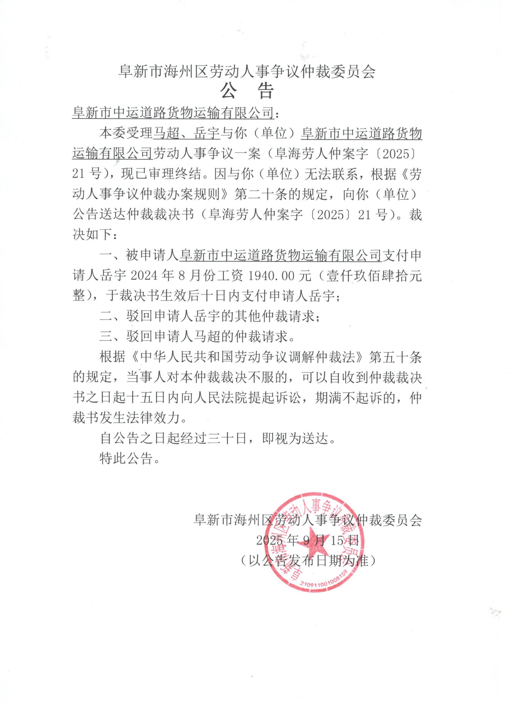 本委受理马超、岳宇与你(单位)阜新市中运道路货物运输有限公司劳动人事争议一案(阜海劳人仲案字〔2025〕21号),现已审理终结。因与你(单位)无法联系,根据《劳动人事争议仲裁办案规则》第二十条的规定,向你(单位)公告送达仲裁裁决书(阜海劳人仲案字〔2025〕21号)。裁决如下: