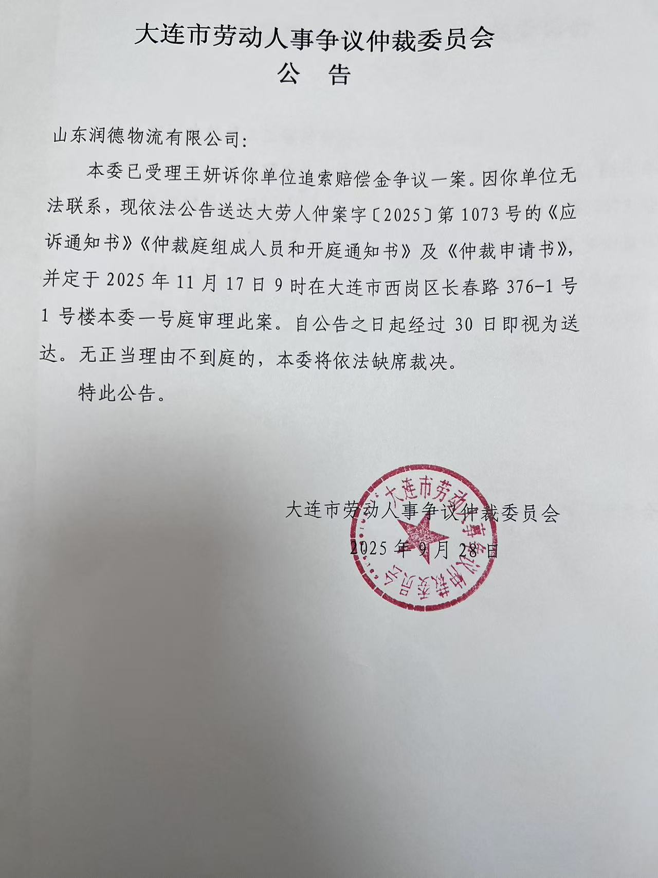本委已受理王妍诉你单位追索赔偿金争议一案。因你单位无法联系,现依法公告送达大劳人仲案字〔2025〕第1073号的《应诉通知书》《仲裁庭组成人员和开庭通知书》及《仲裁申请书》,并定于2025年11月17日9时在大连市西岗区长春路376-1号1号楼本委一号庭审理此案。自公告之日起经过30日即视为送达。无正当理由不到庭的,本委将依法缺席裁决。