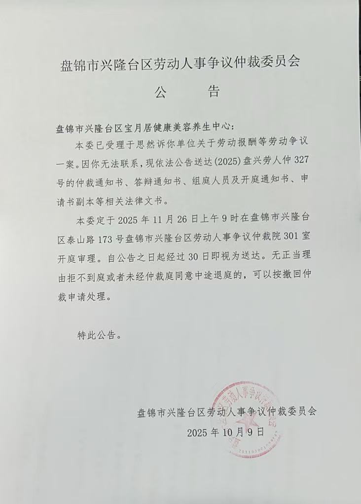 本委已受理于思然诉你(单位)劳动报酬等争议一案,案件编号〔2025〕盘兴劳人仲327号,因用其他方式无法向你单位送达仲裁文书,现依法向你单位公告送达仲裁通知书、答辩通知书、组庭人员及开庭通知书、申请书副本等相关法律文书,上述法律文书自本公告发布之日起经30日即视为送达。提交答辩状和证据的期限为公告送达期满后10日内。