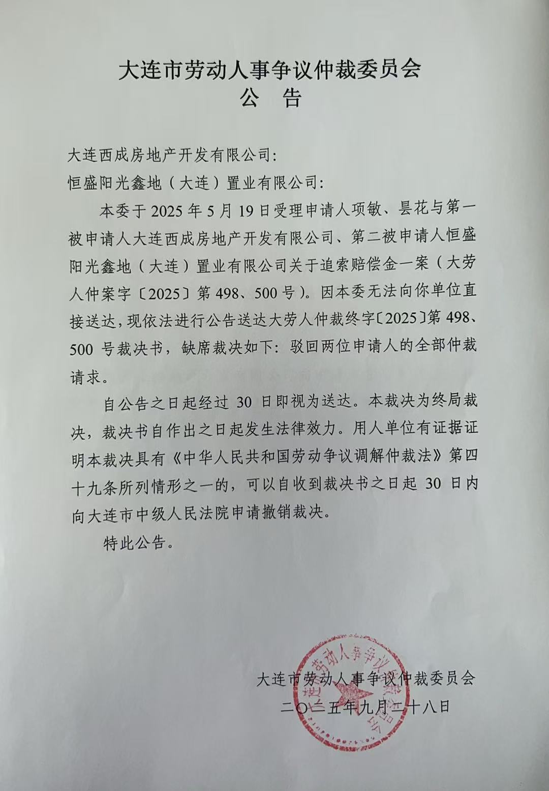 本委于2025年5月19日受理申请人项敏、昙花与第一被申请人大连西成房地产开发有限公司、第二被申请人恒盛阳光鑫地(大连)置业有限公司关于追索赔偿金一案(大劳人仲案字〔2025〕第498、500号)。因本委无法向你单位直接送达,现依法进行公告送达大劳人仲裁终字〔2025〕第498、500号裁决书,缺席裁决如下: