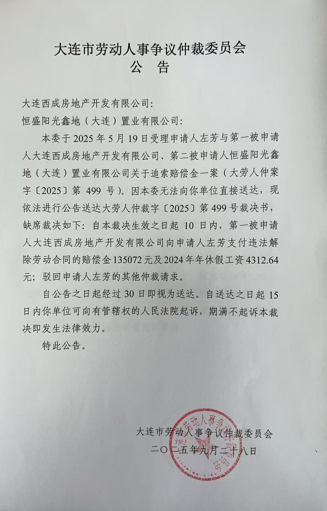 本委于2025年5月19日受理申请人左芳与第一被申请人大连西成房地产开发有限公司、第二被申请人恒盛阳光鑫地(大连)置业有限公司关于追索赔偿金一案(大劳人仲案字〔2025〕第499号)。因本委无法向你单位直接送达,现依法进行公告送达大劳人仲裁字〔2025〕第499号裁决书,缺席裁决如下: