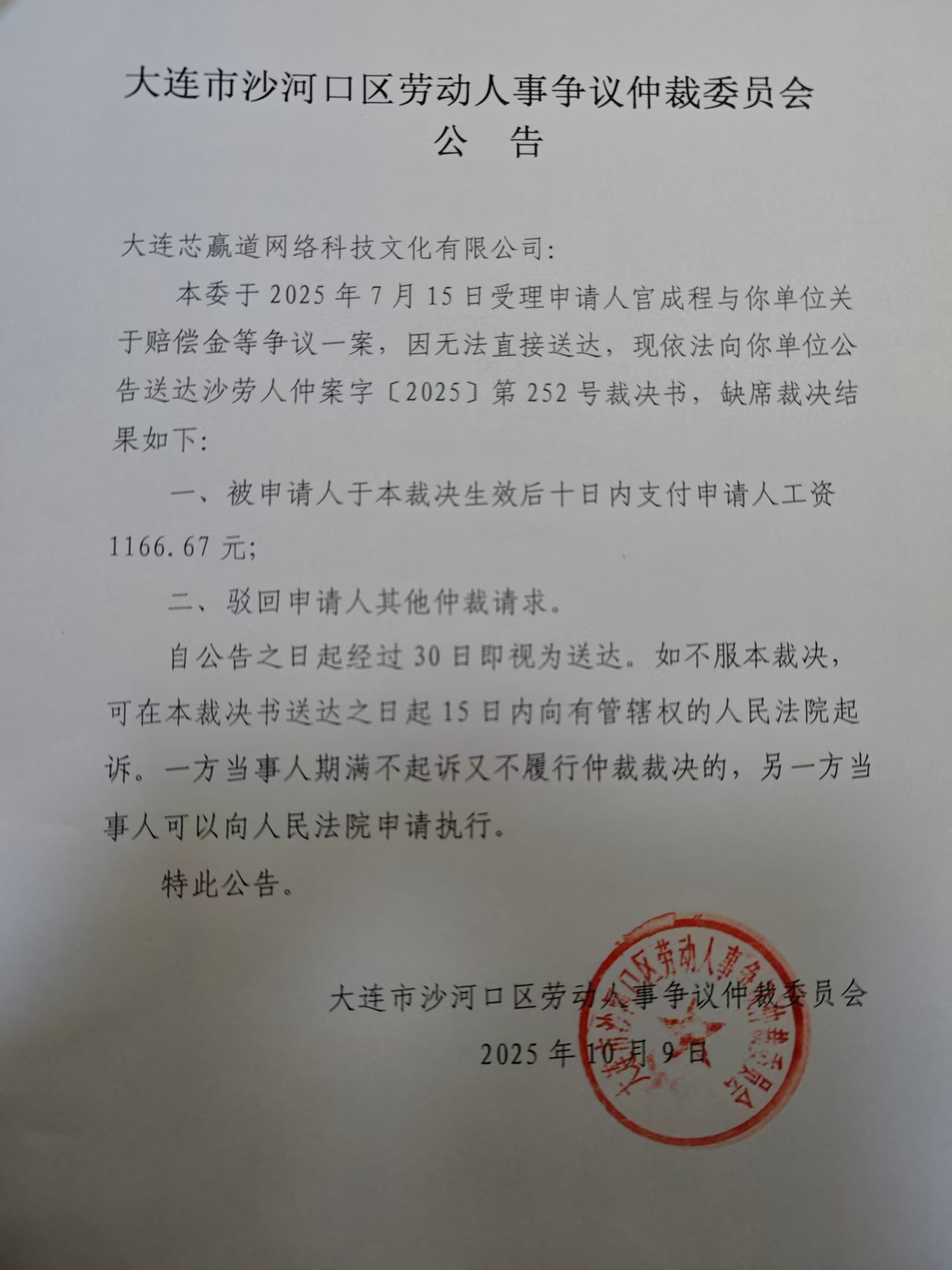 本委于2025年7月15日受理申请人宫成程与你单位关于赔偿金等争议一案,因无法直接送达,现依法向你单位公告送达沙劳人仲案字〔2025〕第252号裁决书,缺席裁决结果如下: