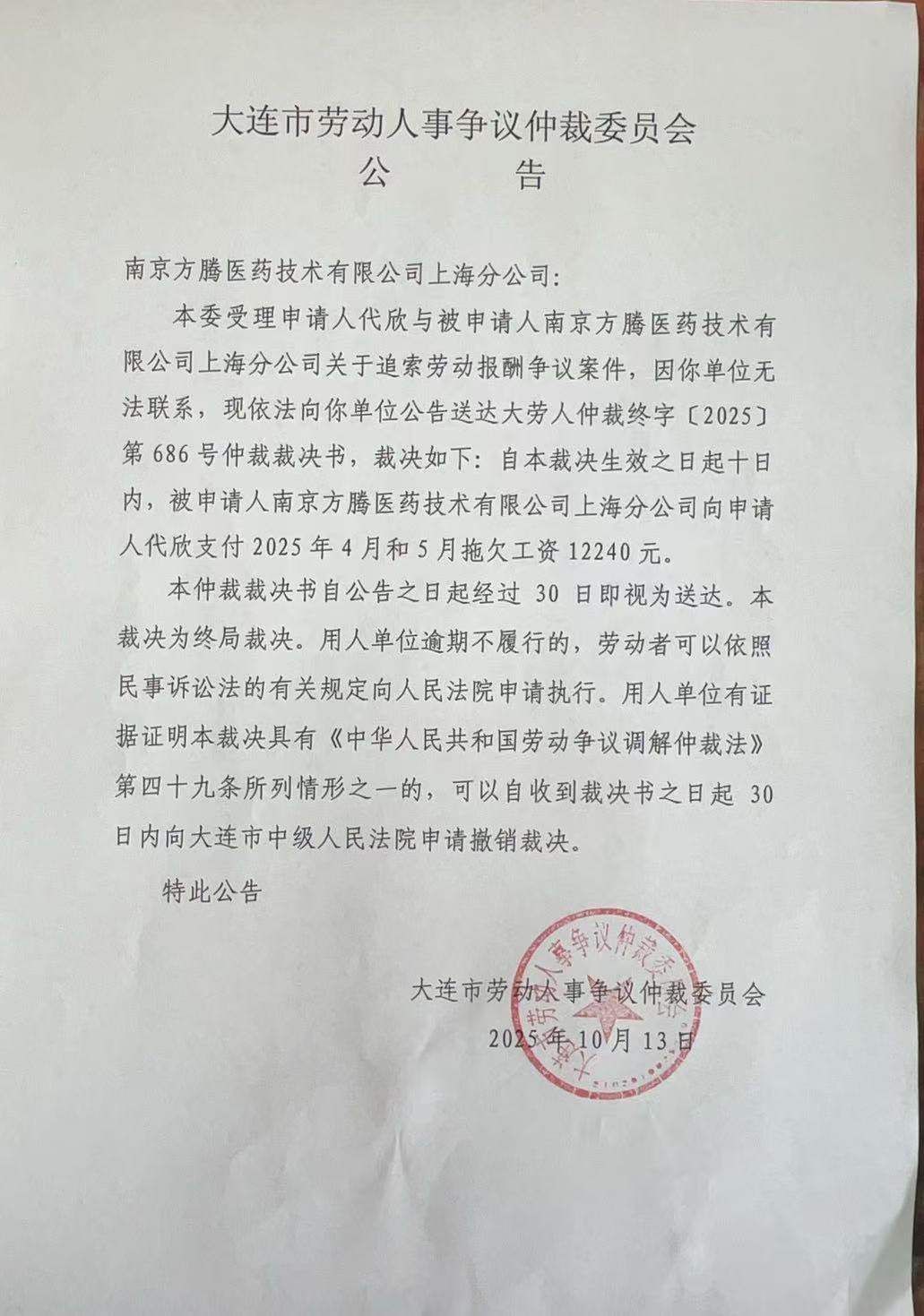 本委受理申请人代欣与被申请人南京方腾医药技术有限公司上海分公司关于追索劳动报酬争议案件,因你单位无法联系,现依法向你单位公告送达大劳人仲裁终字〔2025〕第686号仲裁裁决书,裁决如下: