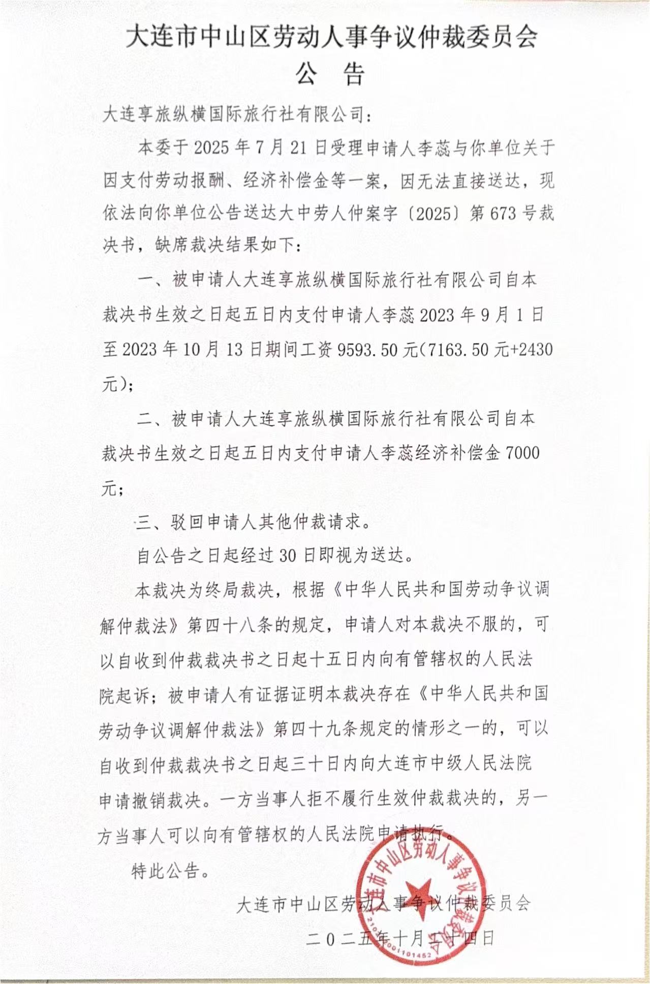 本委于2025年7月21日受理申请人李蕊与你单位关于因支付劳动报酬、经济补偿金等一案,因无法直接送达,现依法向你单位公告送达大中劳人仲案字〔2025〕第673号裁决书,缺席裁决结果如下:
