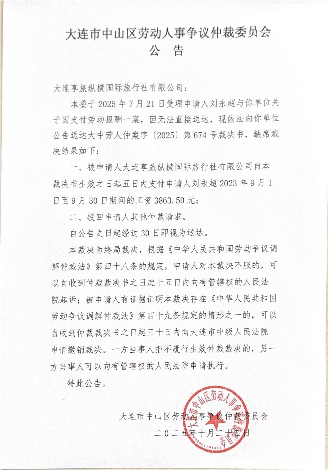 本委于2025年7月21日受理申请人刘永超与你单位关于因支付劳动报酬一案,因无法直接送达,现依法向你单位公告送达大中劳人仲案字〔2025〕第674号裁决书,缺席裁决结果如下:
