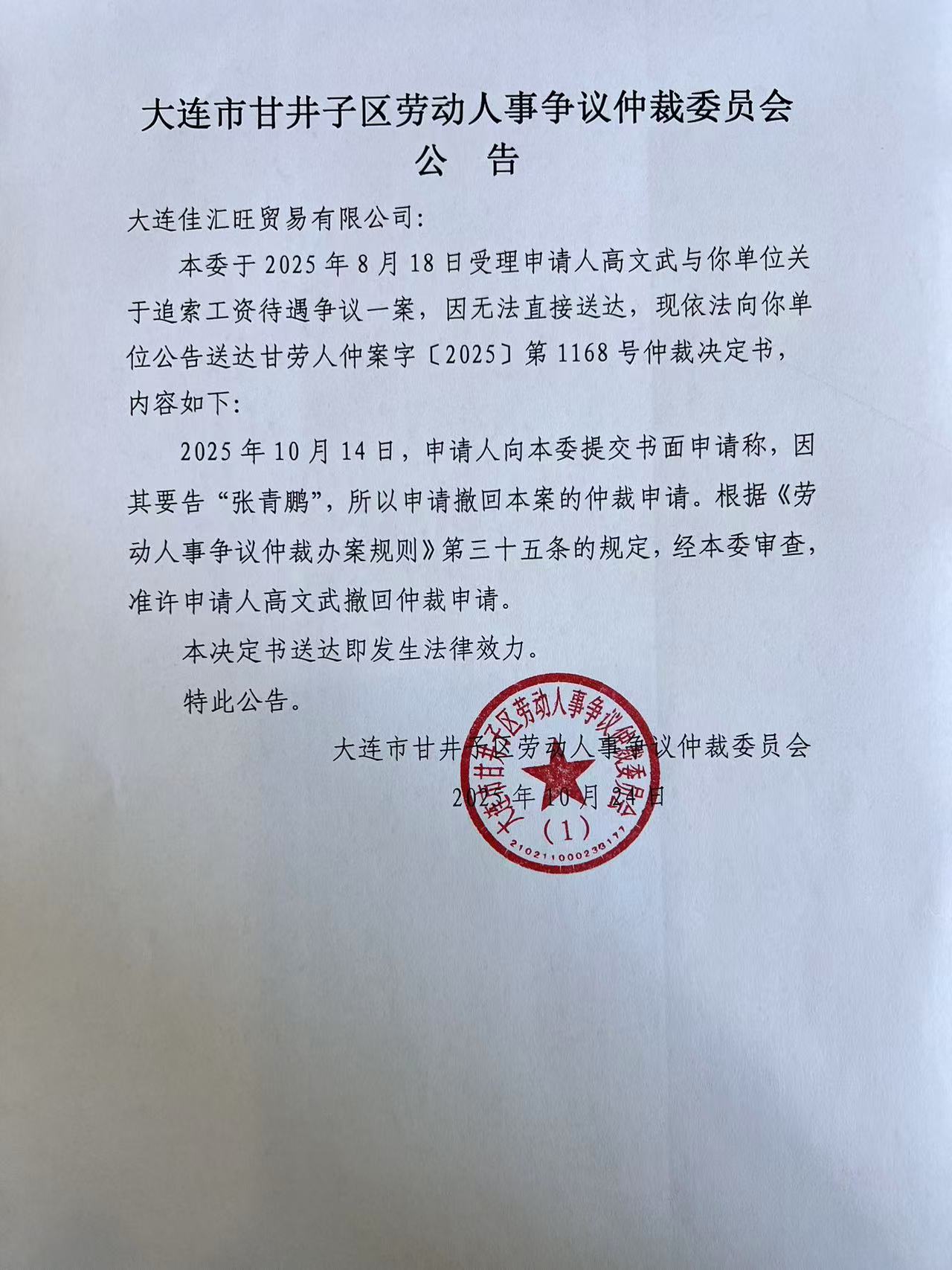 本委于2025年8月18日受理申请人高文武与你单位关于追索工资待遇争议一案,因无法直接送达,现依法向你单位公告送达甘劳人仲案字〔2025〕第1168号仲裁决定书,内容如下: