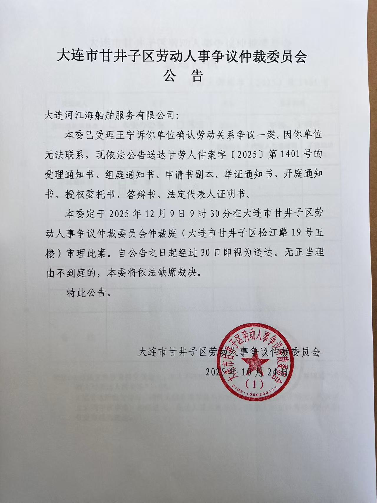 本委定于2025年12月9日9时30分在大连市甘井子区劳动人事争议仲裁委员会仲裁庭(大连市甘井子区松江路19号五楼)审理此案。自公告之日起经过30日即视为送达。无正当理由不到庭的,本委将依法缺席裁决。