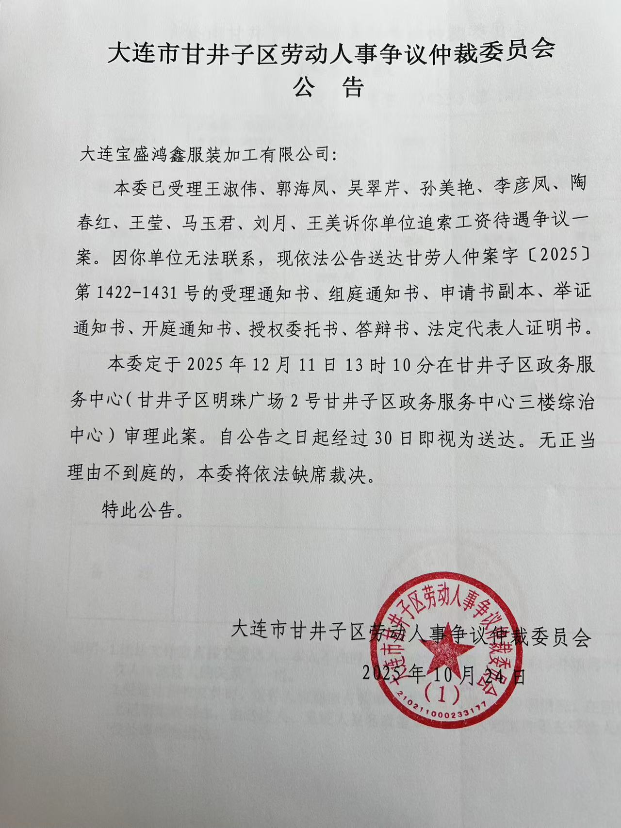 本委已受理王淑伟、郭海凤、吴翠芹、孙美艳、李彦凤、陶春红、王莹、马玉君、刘月、王美诉你单位追索工资待遇争议一案。因你单位无法联系,现依法公告送达甘劳人仲案字〔2025〕第1422-1431号的受理通知书、组庭通知书、申请书副本、举证通知书、开庭通知书、授权委托书、答辩书、法定代表人证明书。