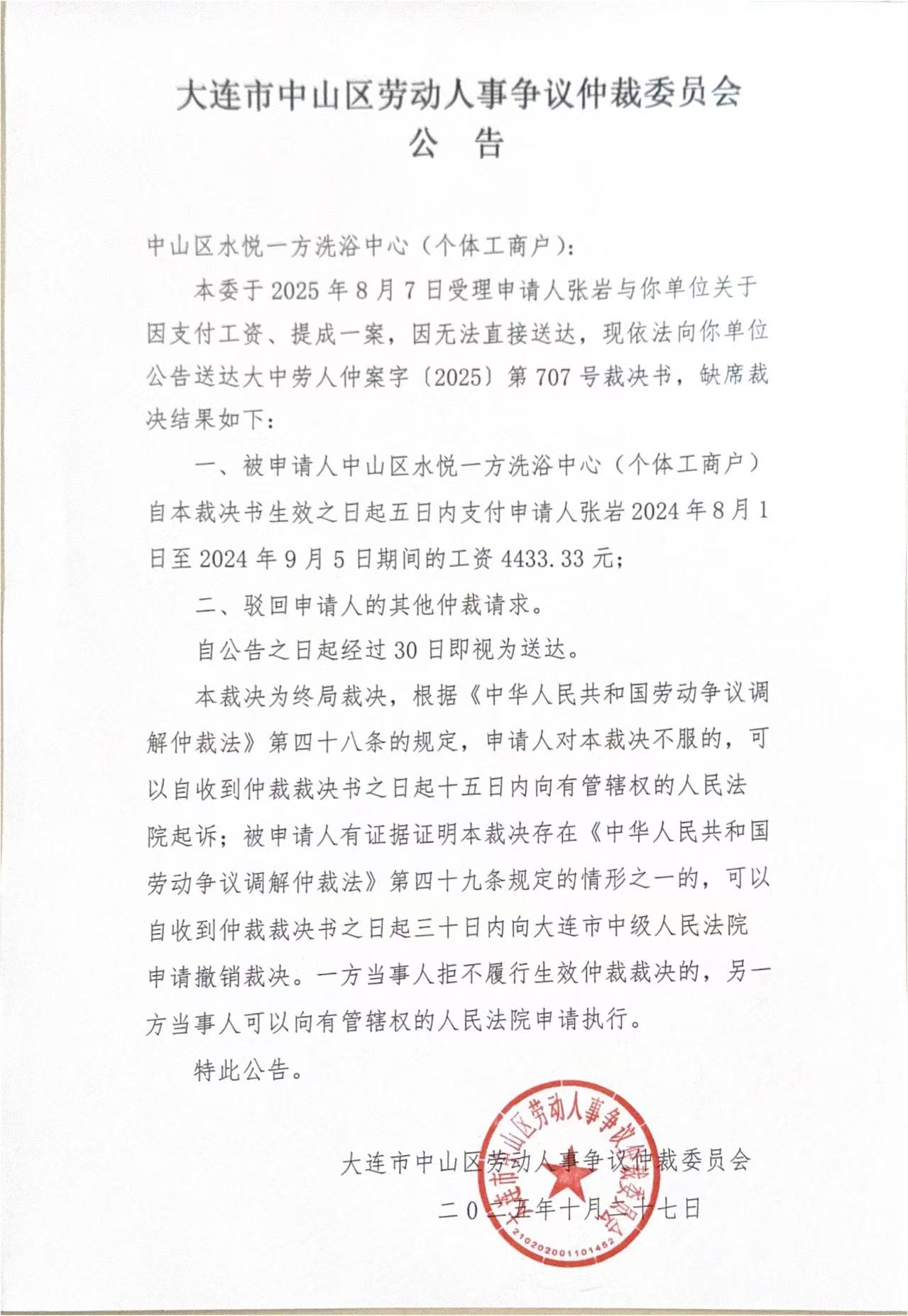 本委于2025年8月7日受理申请人张岩与你单位关于因支付工资、提成一案,因无法直接送达,现依法向你单位公告送达大中劳人仲案字〔2025〕第707号裁决书,缺席裁决结果如下:
