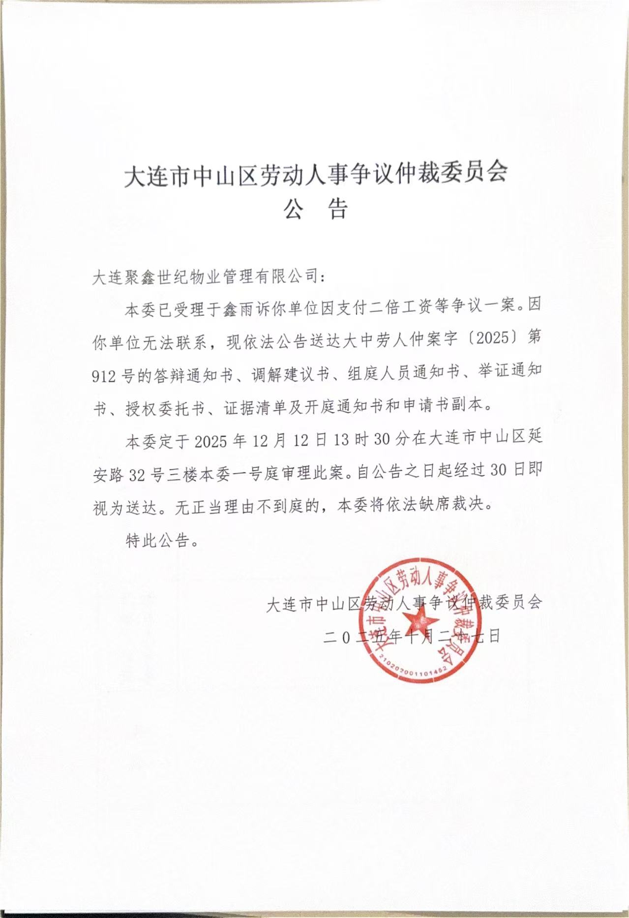本委已受理于鑫雨诉你单位因支付二倍工资等争议一案。因你单位无法联系,现依法公告送达大中劳人仲案字〔2025〕第912号的答辩通知书、调解建议书、组庭人员通知书、举证通知书、授权委托书、证据清单及开庭通知书和申请书副本。