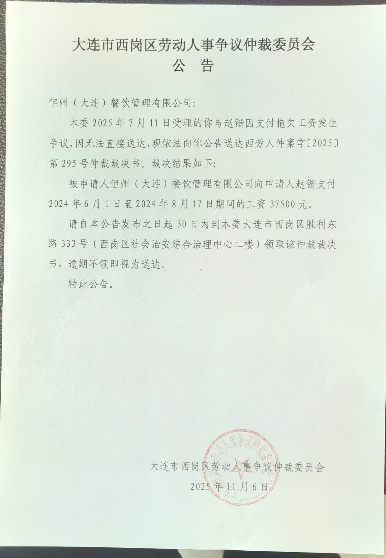 本委2025年7月11日受理的你与赵锴因支付拖欠工资发生争议,因无法直接送达,现依法向你公告送达西劳人仲案字〔2025〕第295号仲裁裁决书。裁决结果如下: