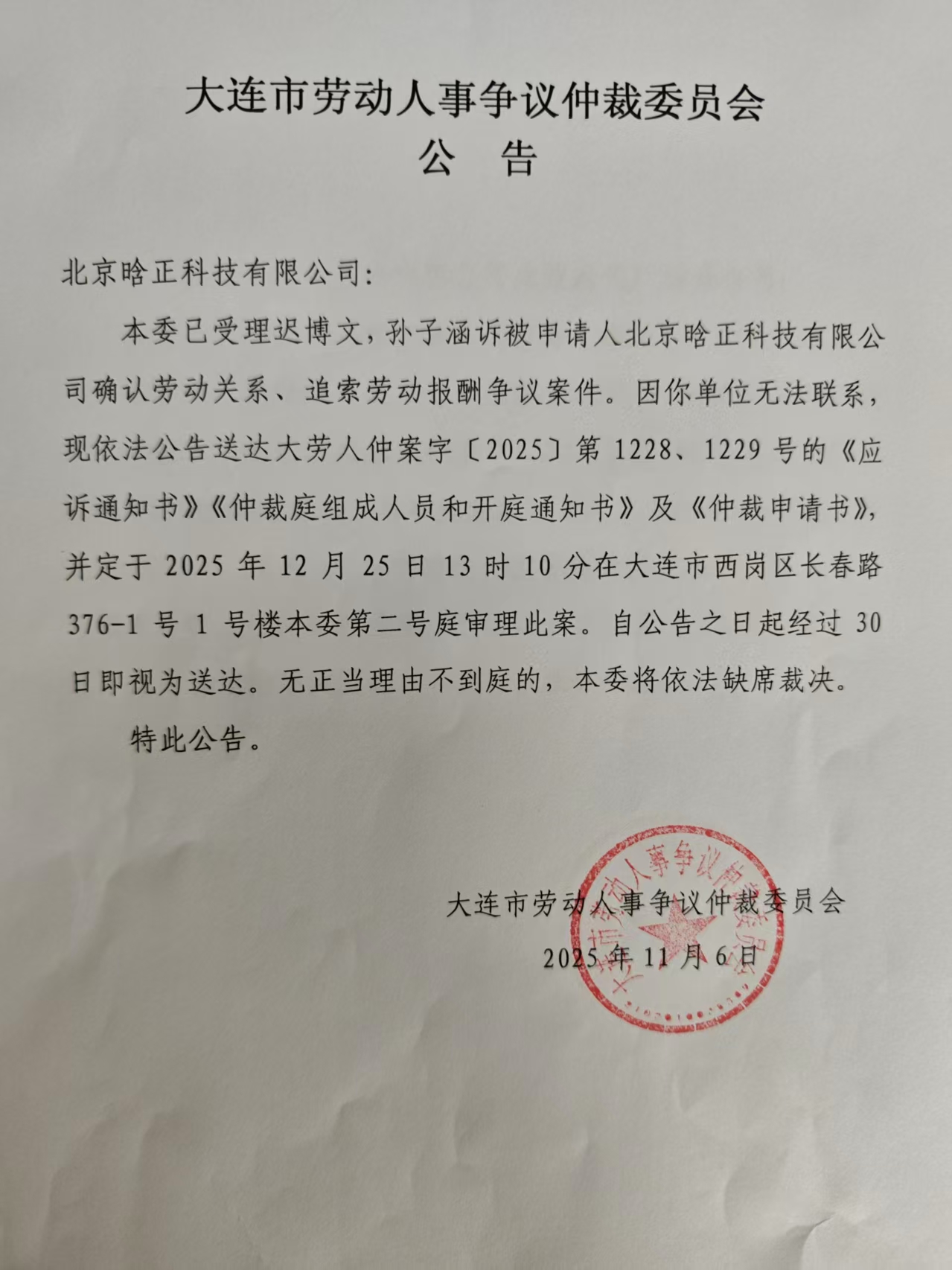 本委已受理迟博文,孙子涵诉被申请人北京晗正科技有限公司确认劳动关系、追索劳动报酬争议案件。因你单位无法联系,现依法公告送达大劳人仲案字〔2025〕第1228、1229号的《应诉通知书》《仲裁庭组成人员和开庭通知书》及《仲裁申请书》,并定于2025年12月25日13时10分在大连市西岗区长春路376-1号1号楼本委第二号庭审理此案。自公告之日起经过30日即视为送达。无正当理由不到庭的,本委将依法缺席裁决。