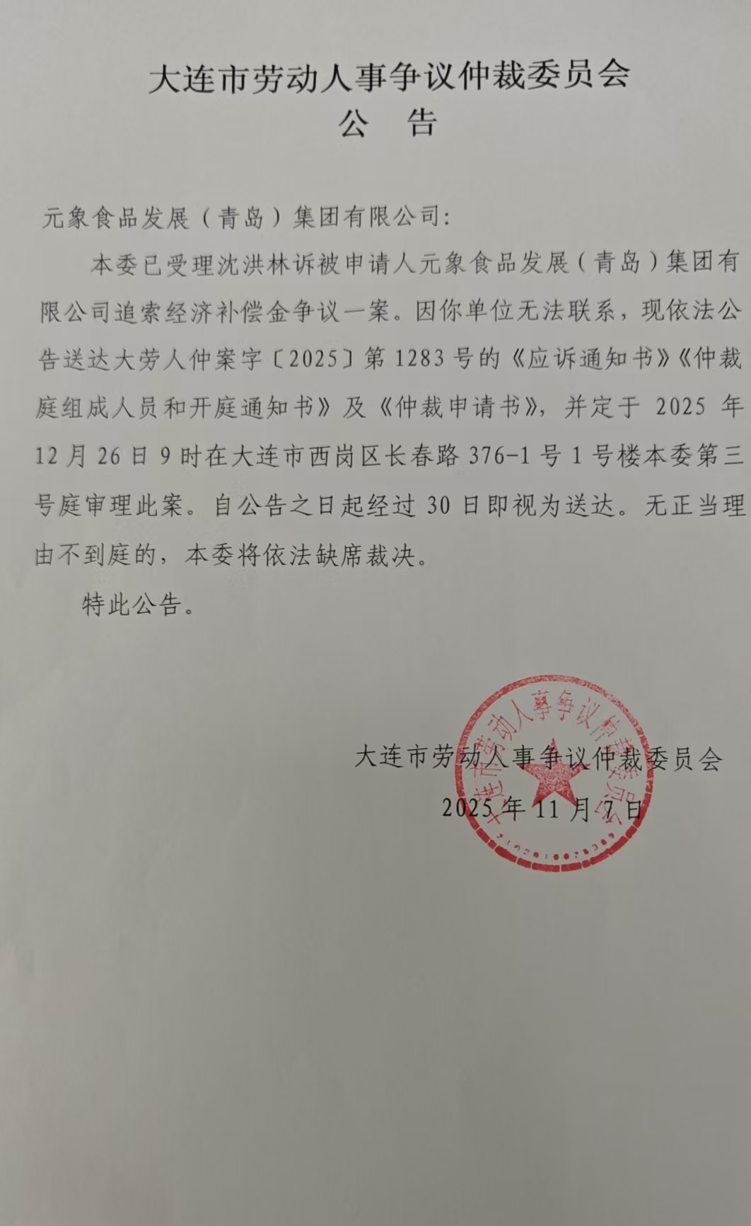 本委已受理沈洪林诉被申请人元象食品发展(青岛)集团有限公司追索经济补偿金争议一案。因你单位无法联系,现依法公告送达大劳人仲案字〔2025〕第1283号的《应诉通知书》《仲裁庭组成人员和开庭通知书》及《仲裁申请书》,并定于2025年12月26日9时在大连市西岗区长春路376-1号1号楼本委第三号庭审理此案。自公告之日起经过30日即视为送达。无正当理由不到庭的,本委将依法缺席裁决。
