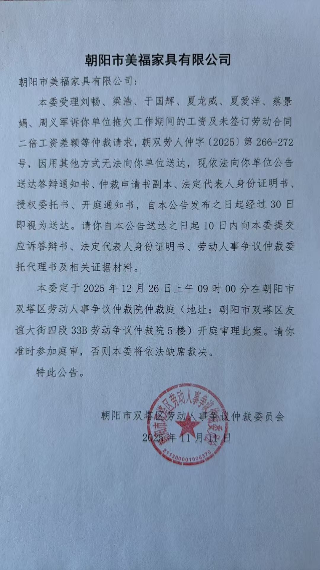 本委受理刘畅、梁浩、于国辉、夏龙威、夏爱洋、蔡景娟、周义军诉你单位拖欠工作期间的工资及未签订劳动合同二倍工资差额等仲裁请求,朝双劳人仲字〔2025〕第266-272号,因用其他方式无法向你单位送达,现依法向你单位公告送达答辩通知书、仲裁申请书副本、法定代表人身份证明书、授权委托书、开庭通知书,自本公告发布之日起经过30日即视为送达。请你自本公告送达之日起10日内向本委提交应诉答辩书、法定代表人身份证明书、劳动人事争议仲裁委托代理书及相关证据材料。