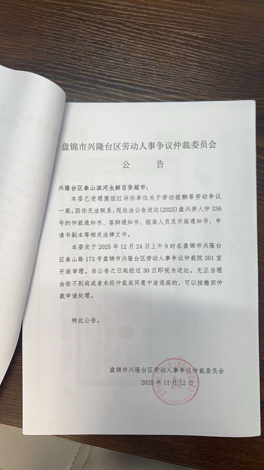 本委定于2025年12月24日上午9时在盘锦市兴隆台区泰山路173号盘锦市兴隆台区劳动人事争议仲裁院301室开庭审理。届时不到庭,本委将依法缺席裁决。