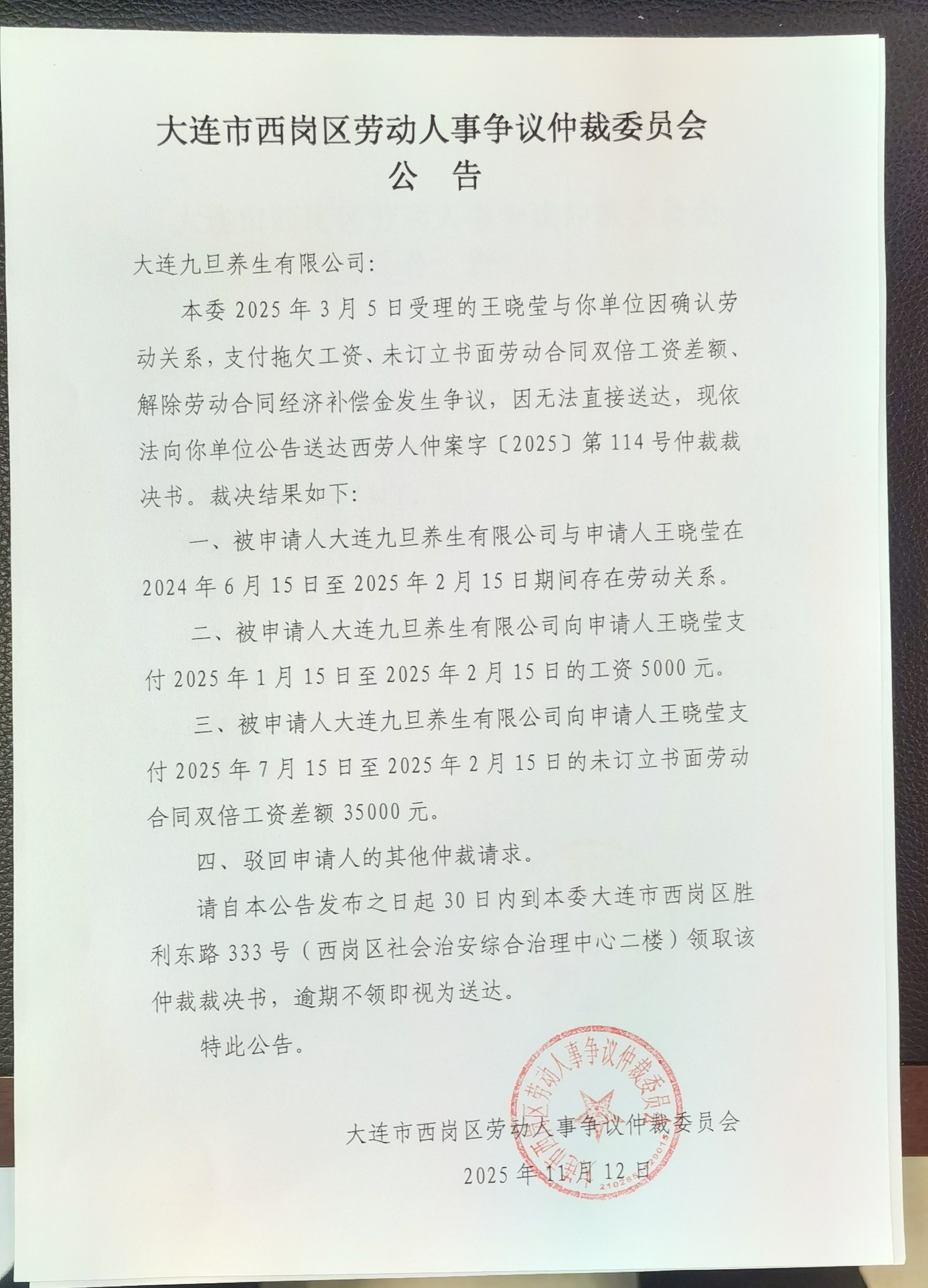 本委2025年3月5日受理的王晓莹与你单位因确认劳动关系,支付拖欠工资、未订立书面劳动合同双倍工资差额、解除劳动合同经济补偿金发生争议,因无法直接送达,现依法向你单位公告送达西劳人仲案字〔2025〕第114号仲裁裁决书。裁决结果如下: