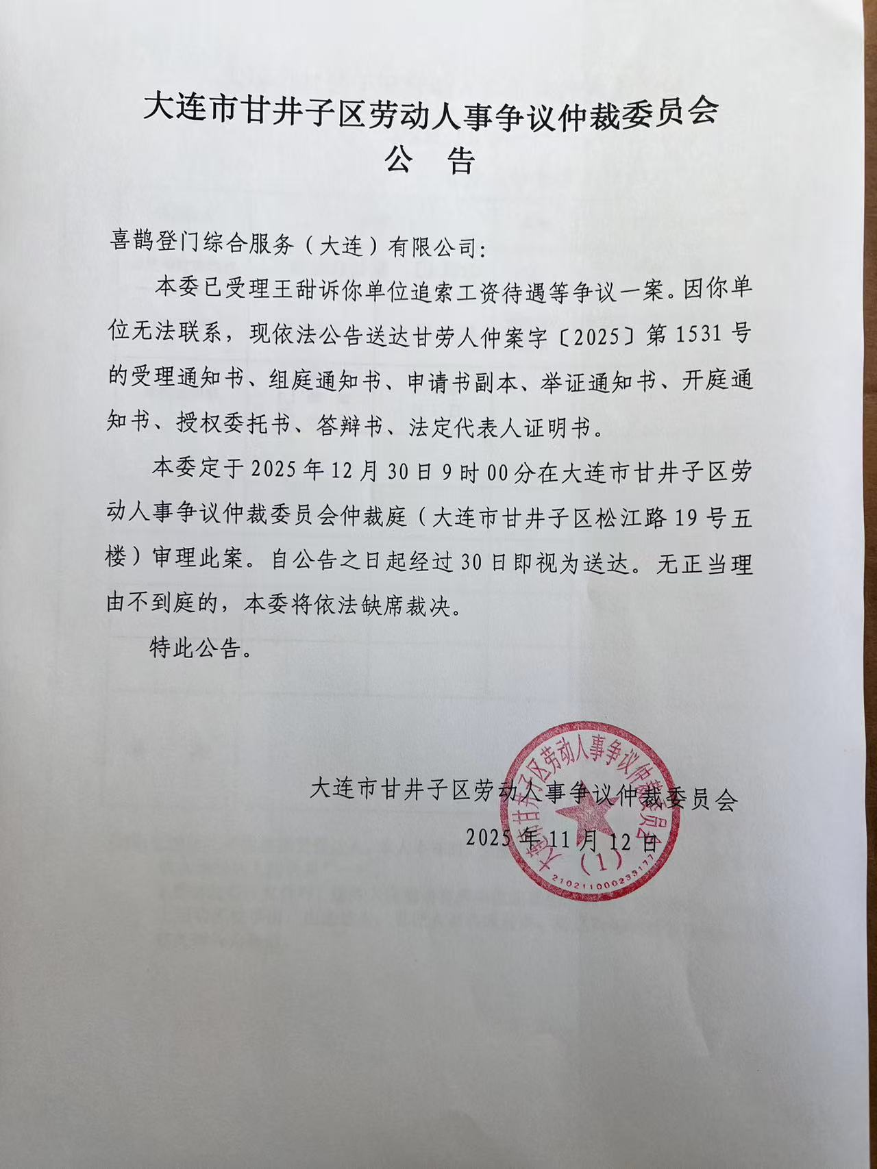 本委定于2025年12月30日9时00分在大连市甘井子区劳动人事争议仲裁委员会仲裁庭(大连市甘井子区松江路19号五楼)审理此案。自公告之日起经过30日即视为送达。无正当理由不到庭的,本委将依法缺席裁决。