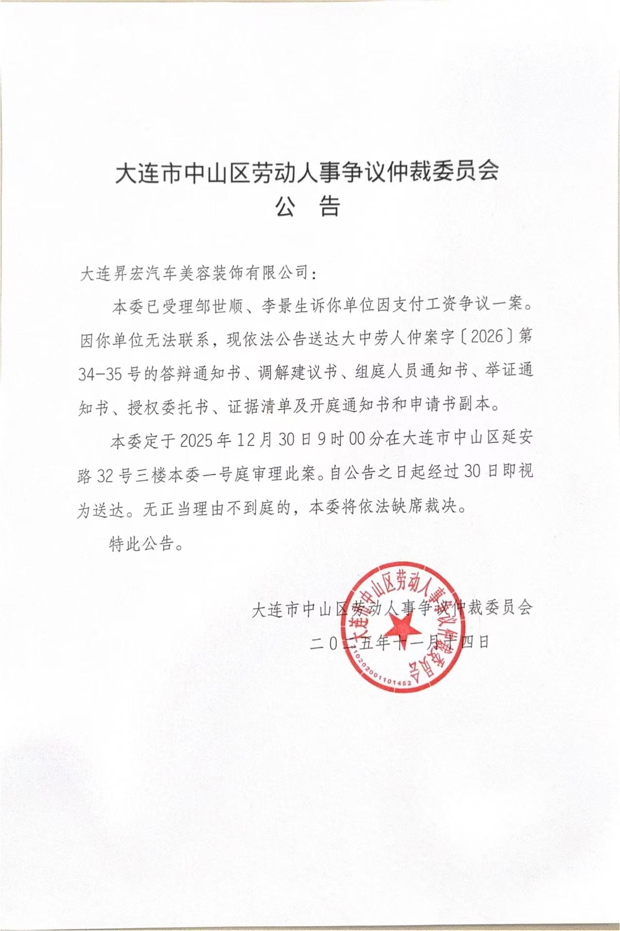 本委定于2025年12月30日9时00分在大连市中山区延安路32号三楼本委一号庭审理此案。自公告之日起经过30日即视为送达。无正当理由不到庭的,本委将依法缺席裁决。