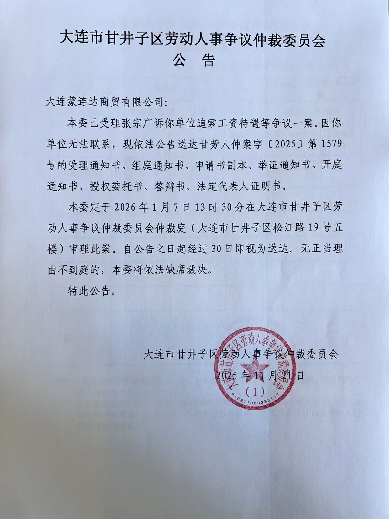 本委定于2026年1月7日13时30分在大连市甘井子区劳动人事争议仲裁委员会仲裁庭(大连市甘井子区松江路19号五楼)审理此案。自公告之日起经过30日即视为送达。无正当理由不到庭的,本委将依法缺席裁决。