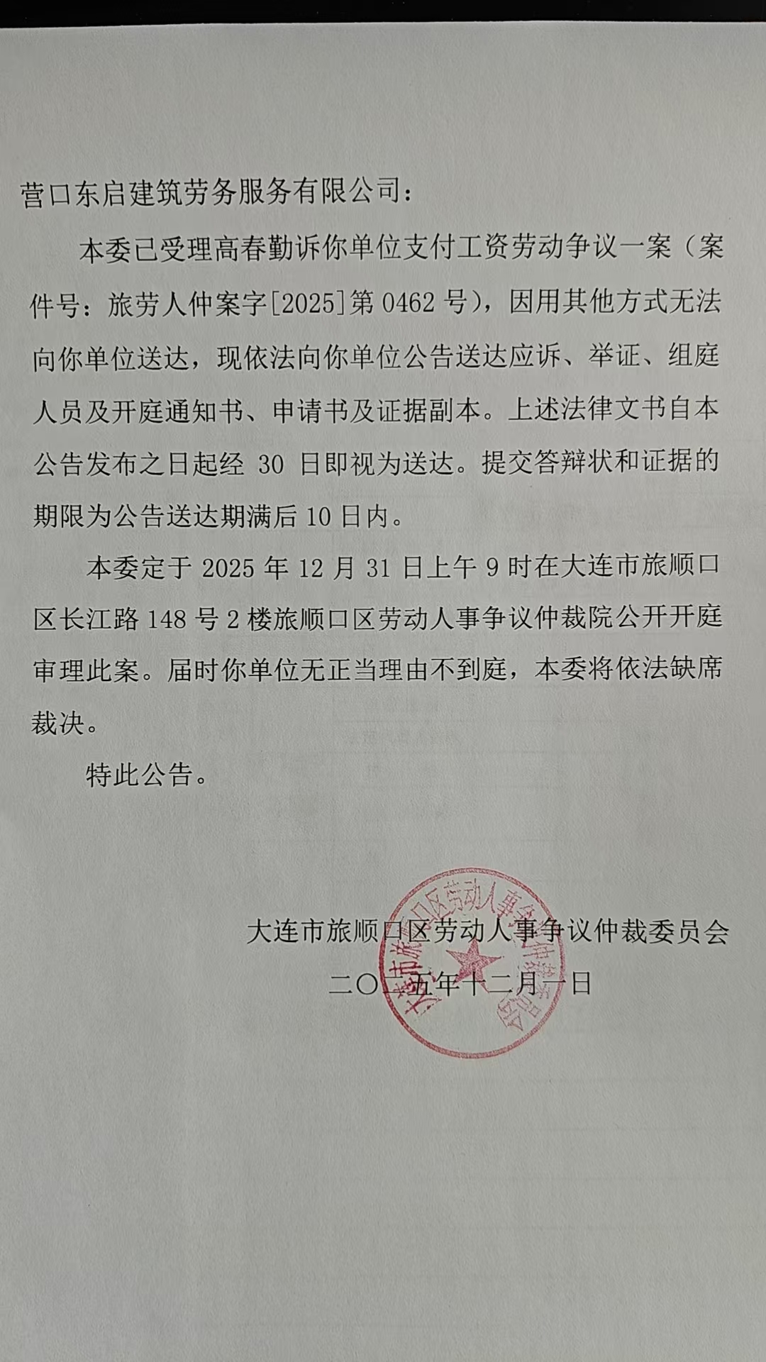 本委已受理高春勤诉你单位支付工资劳动争议一案(案件号:旅劳人仲案字〔2025〕第0462号),因用其他方式无法向你单位送达,现依法向你单位公告送达应诉、举证、组庭人员及开庭通知书、申请书及证据副本。上述法律文书自本公告发布之日起经30日即视为送达。提交答辩状和证据的期限为公告送达期满后10日内。