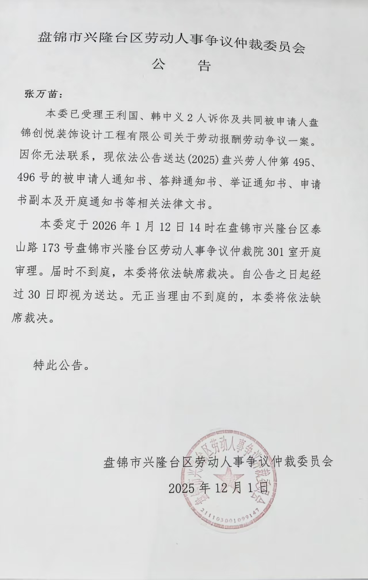 本委已受理王利国、韩中义2人诉你及共同被申请人盘锦创悦装饰设计工程有限公司关于劳动报酬劳动争议一案。因你无法联系,现依法公告送达〔2025〕盘兴劳人仲第495、496号的被申请人通知书、答辩通知书、举证通知书、申请书副本及开庭通知书等相关法律文书,上述法律文书自本公告发布之日起经30日即视为送达。提交答辩状和证据的期限为公告送达期满后10日内。