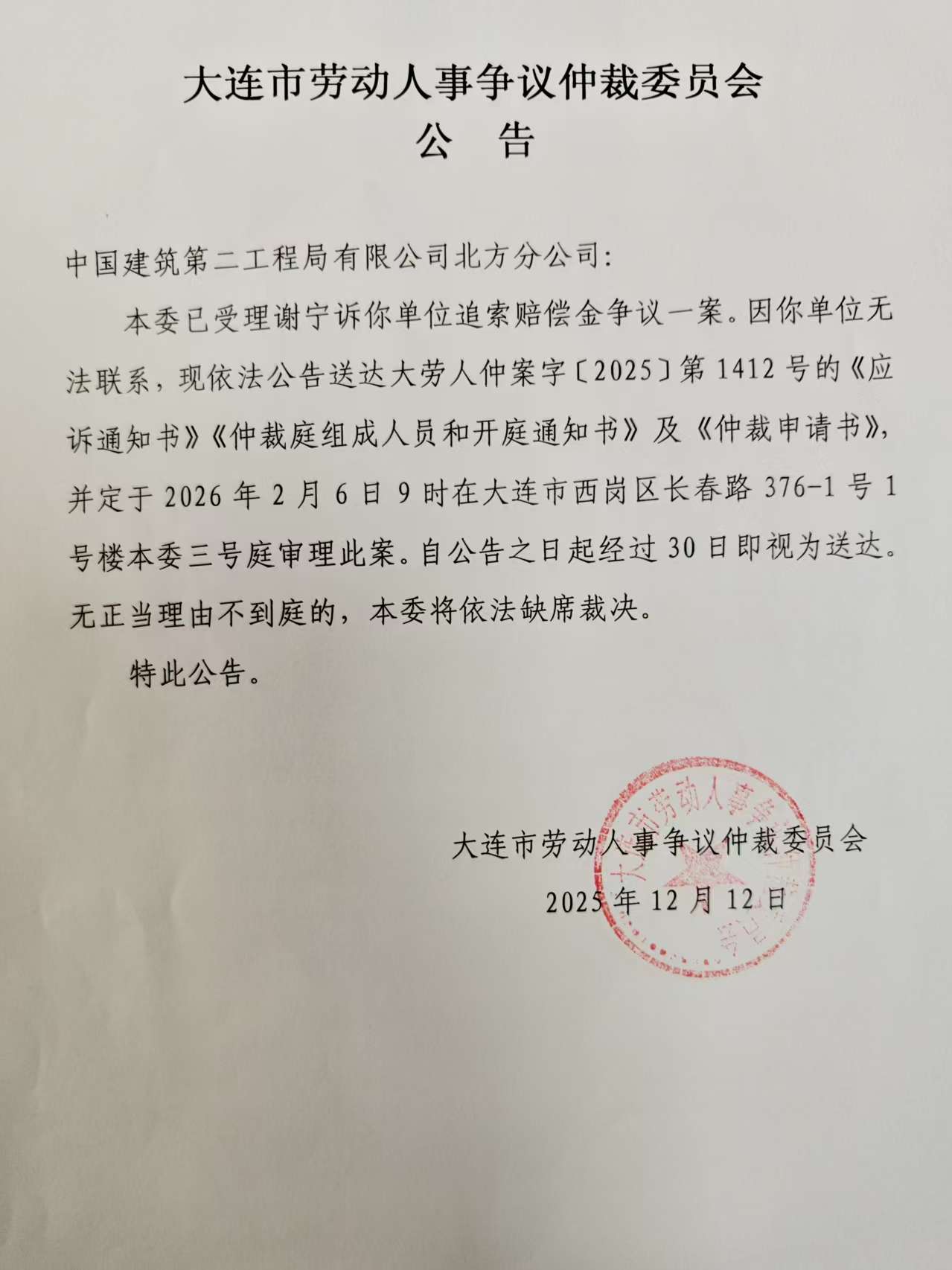 本委已受理谢宁诉你单位追索赔偿金争议一案。因你单位无法联系,现依法公告送达大劳人仲案字〔2025〕第1412号的《应诉通知书》《仲裁庭组成人员和开庭通知书》及《仲裁申请书》,并定于2026年2月6日9时在大连市西岗区长春路376-1号1号楼本委三号庭审理此案。自公告之日起经过30日即视为送达。无正当理由不到庭的,本委将依法缺席裁决。