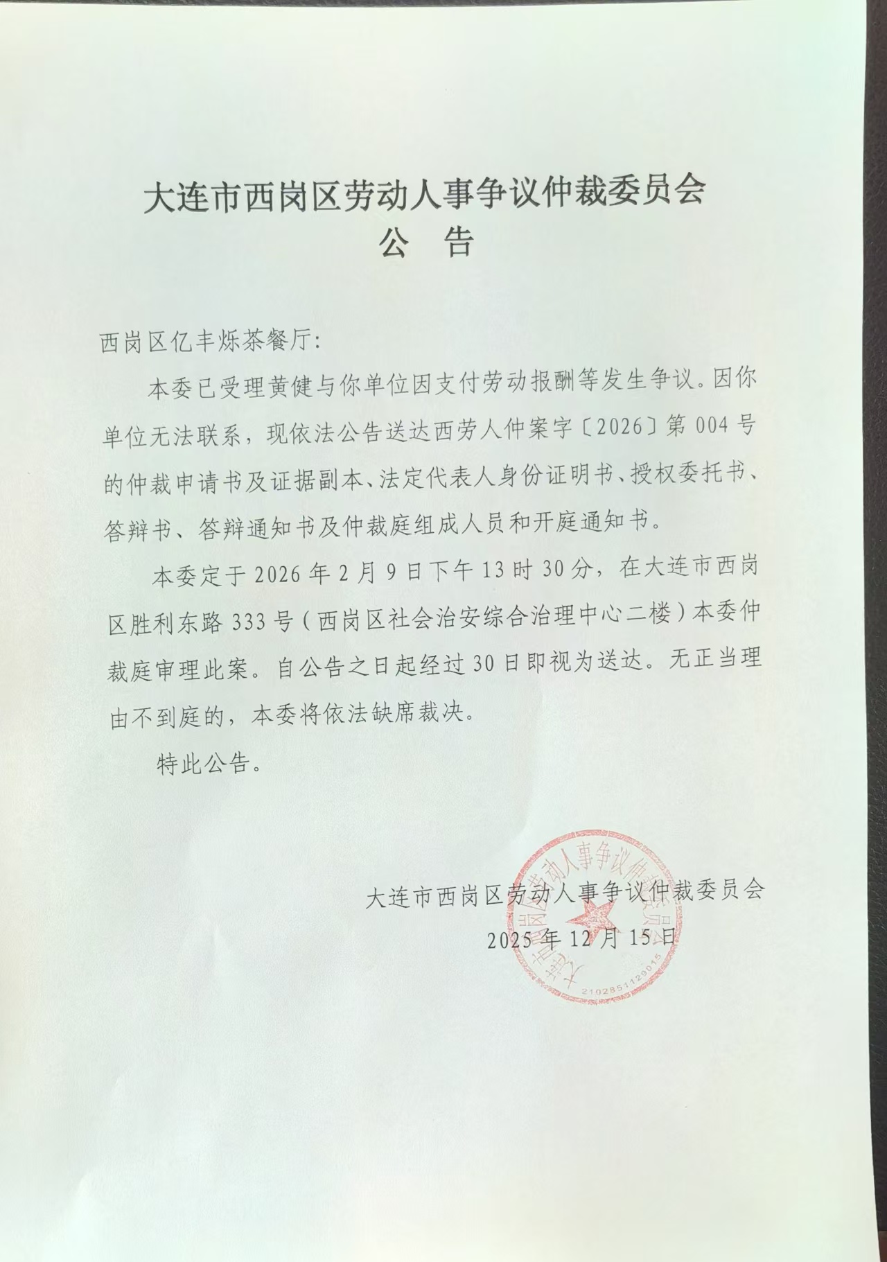 本委定于2026年2月9日13时30分,在大连市西岗区胜利东路333号(西岗区社会治安综合治理中心二楼)本委仲裁庭审理此案。自公告之日起经过30日即视为送达。无正当理由不到庭的,本委将依法缺席裁决。