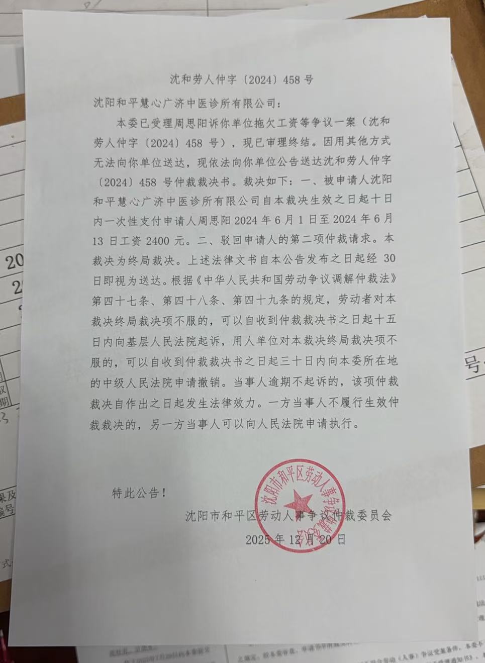 本委已受理周思阳诉你单位拖欠工资等争议一案(沈和劳人仲字〔2024〕458号),现已审理终结。因用其他方式无法向你单位送达,现依法向你单位公告送达沈和劳人仲字〔2024〕458号仲裁裁决书。裁决如下: