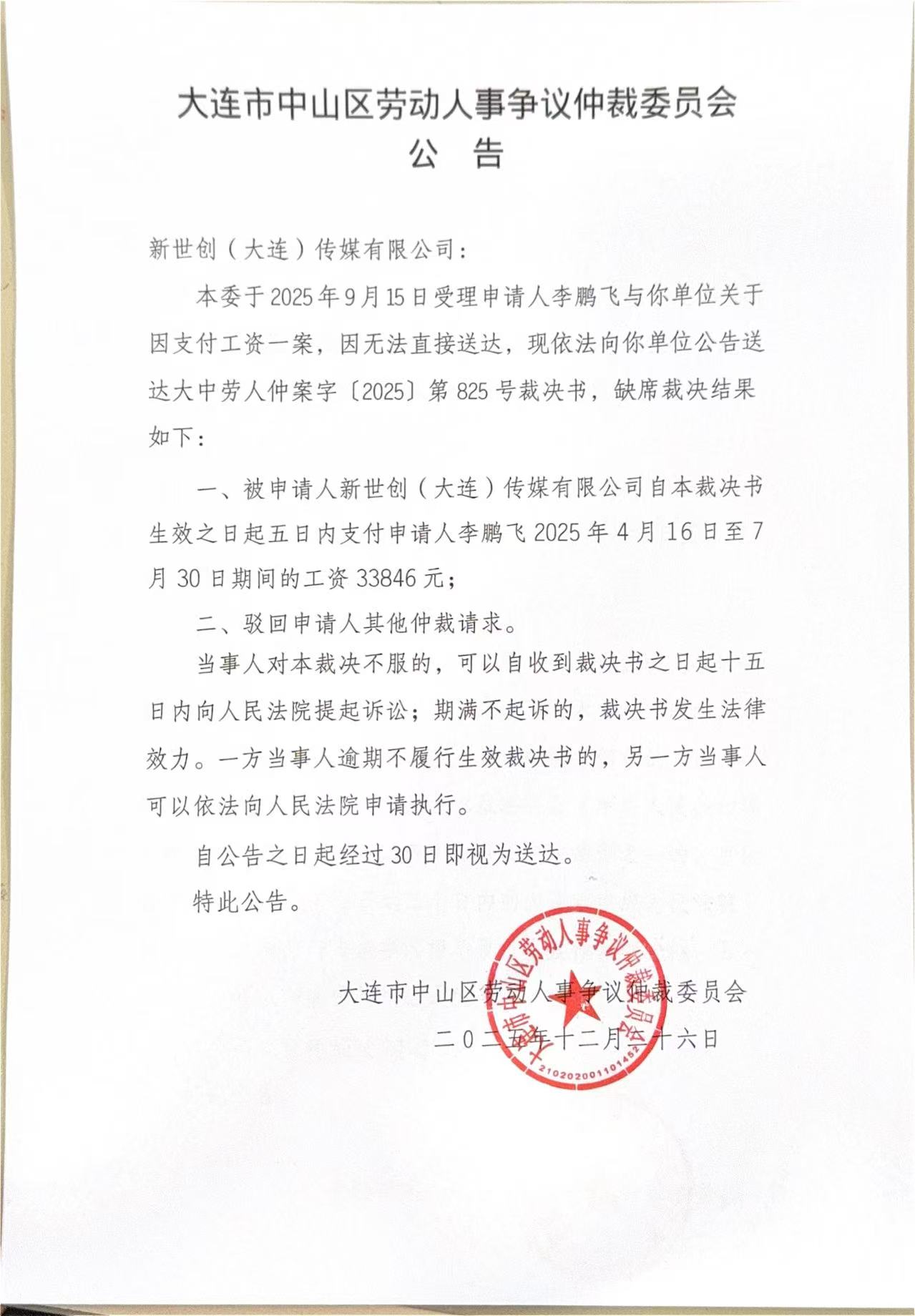 本委于2025年9月15日受理申请人李鹏飞与你单位关于因支付工资一案,因无法直接送达,现依法向你单位公告送达大中劳人仲案字〔2025〕第825号裁决书,缺席裁决结果如下: