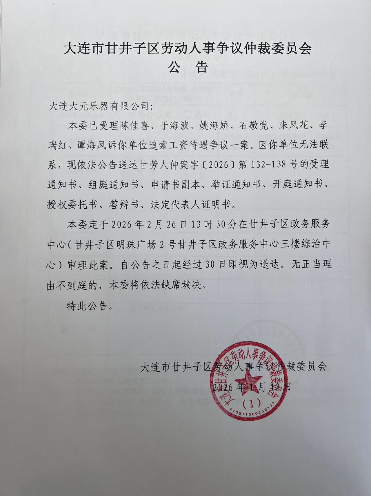 本委定于2026年2月26日13时30分在甘井子区政务服务中心(甘井子区明珠广场2号甘井子区政务服务中心三楼综治中心)审理此案。自公告之日起经过30日即视为送达。无正当理由不到庭的,本委将依法缺席裁决。