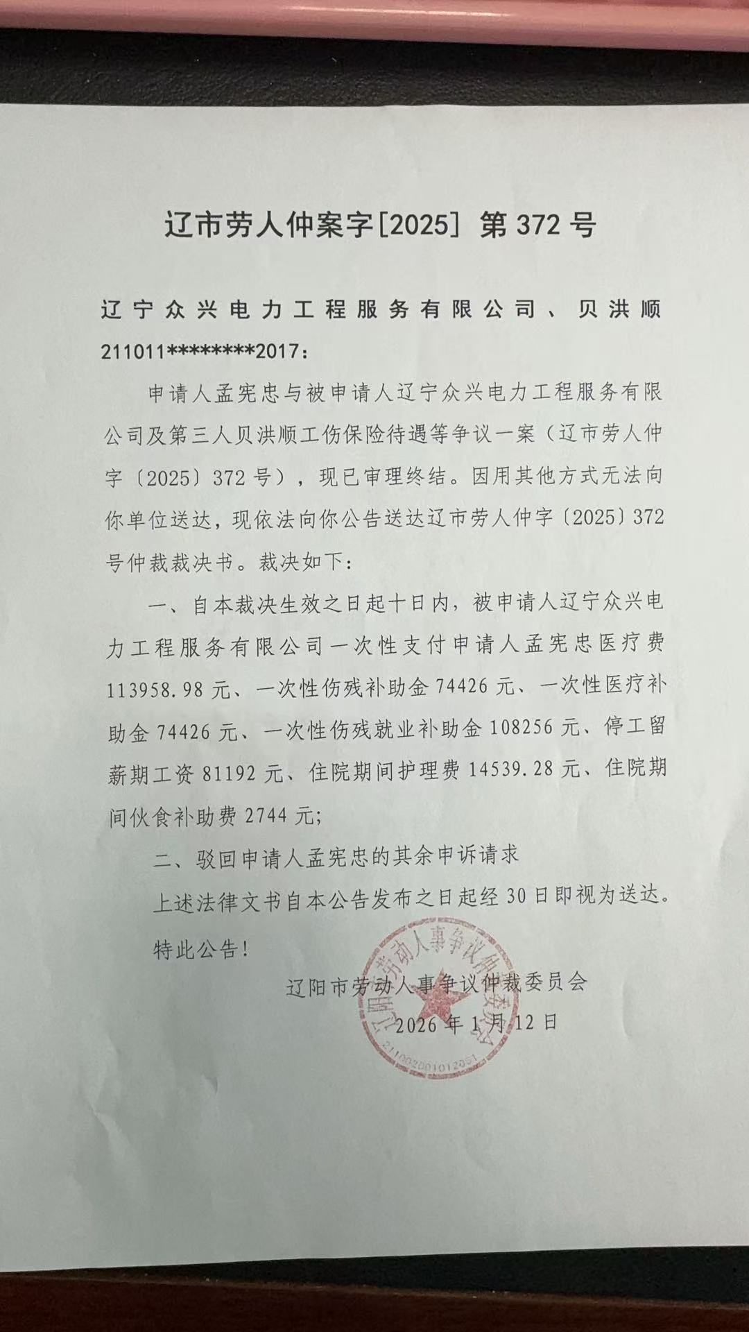 申请人孟宪忠与被申请人辽宁众兴电力工程服务有限公司及第三人贝洪顺工伤保险待遇等争议一案(辽市劳人仲字〔2025〕372号),现已审理终结。因用其他方式无法向你单位送达,现依法向你公告送达辽市劳人仲字〔2025〕372号仲裁裁决书。裁决如下: