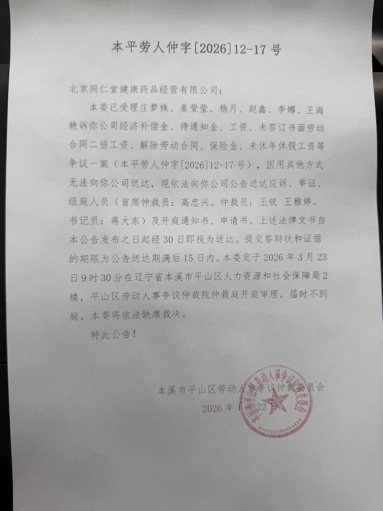 本委定于2026年3月23日9时30分在辽宁省本溪市平山区人力资源和社会保障局2楼,平山区劳动人事争议仲裁院仲裁庭开庭审理。届时不到庭,本委将依法缺席裁决。