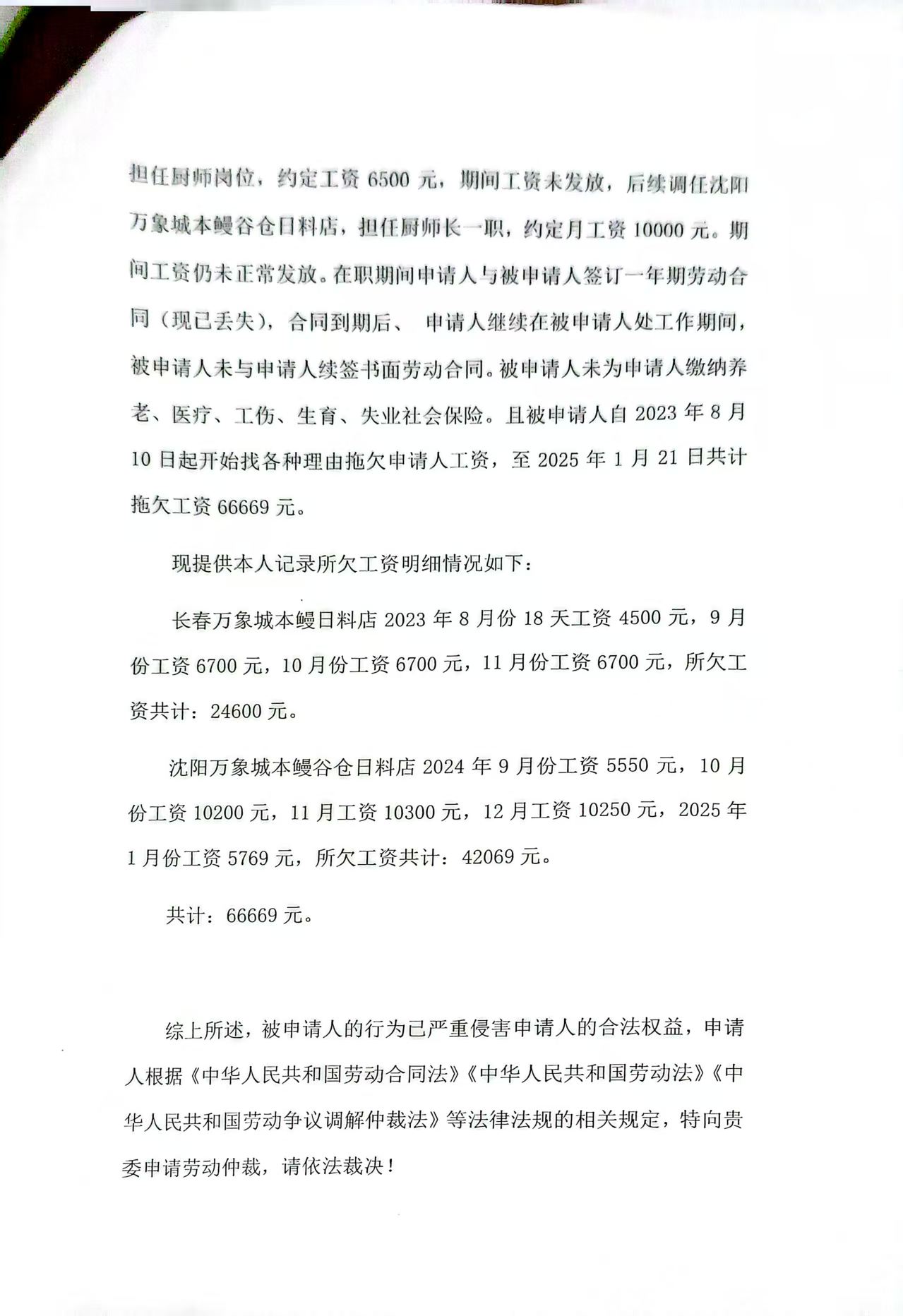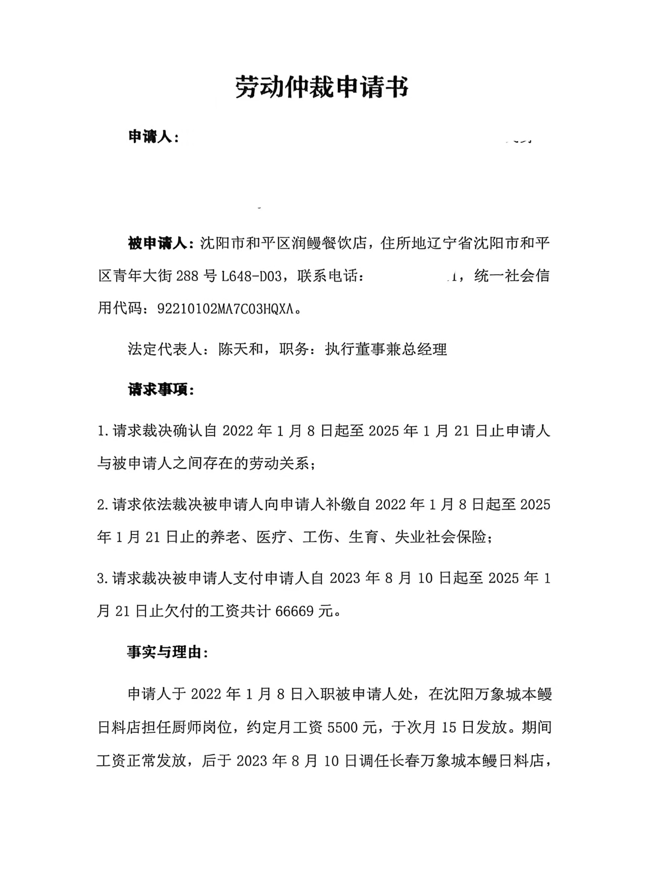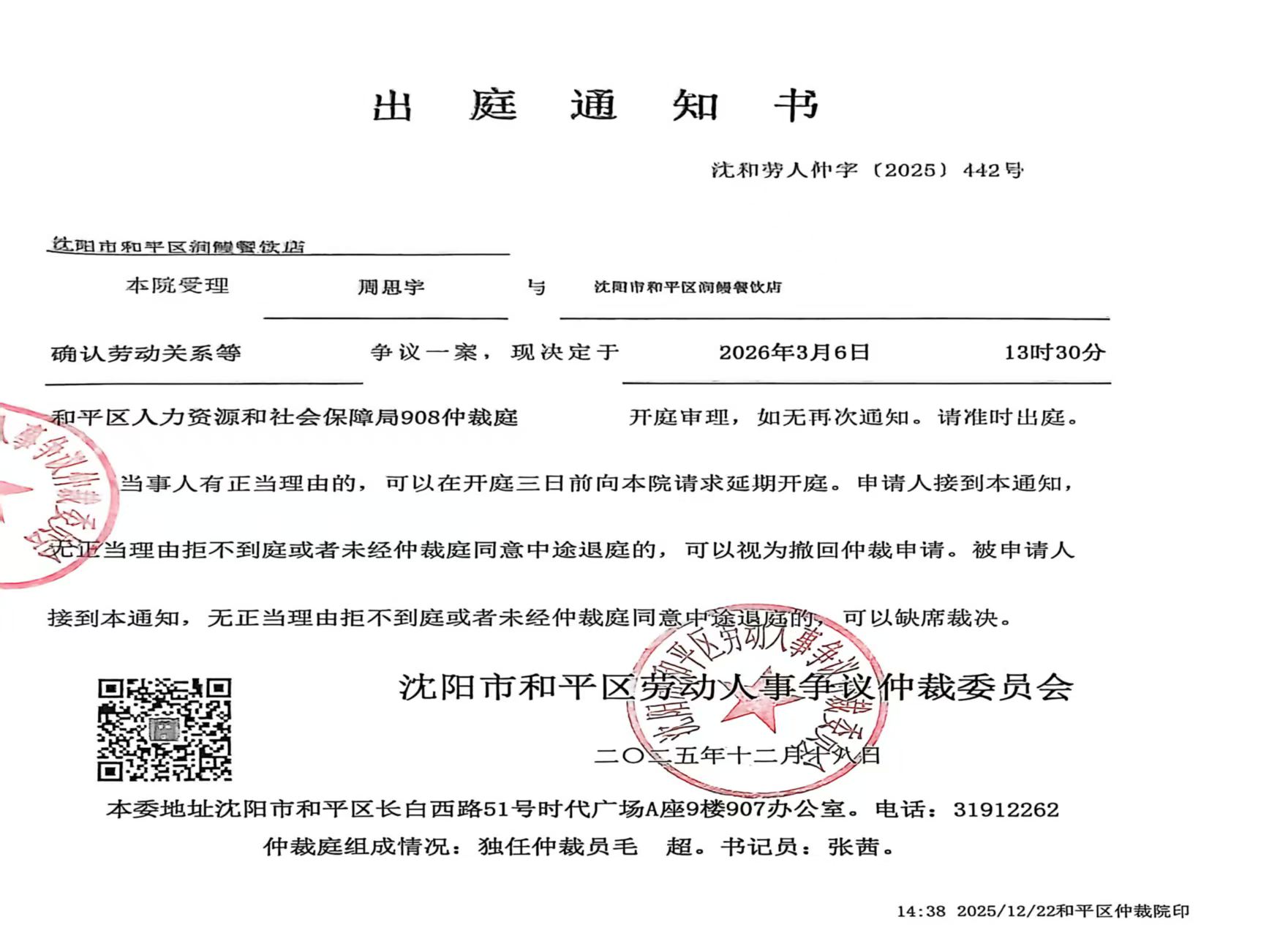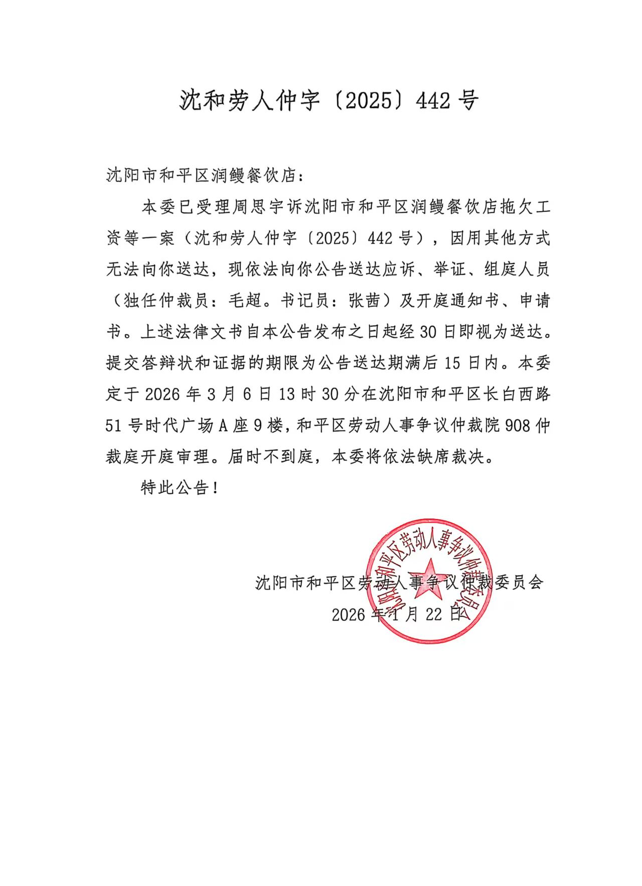 本委已受理周思宇诉沈阳市和平区润鳗餐饮店拖欠工资等一案(沈和劳人仲字〔2025〕442号),因用其他方式无法向你送达,现依法向你公告送达应诉、举证、组庭人员(独任仲裁员:毛超。书记员:张茜)及开庭通知书、申请书。上述法律文书自本公告发布之日起经30日即视为送达。提交答辩状和证据的期限为公告送达期满后15日内。