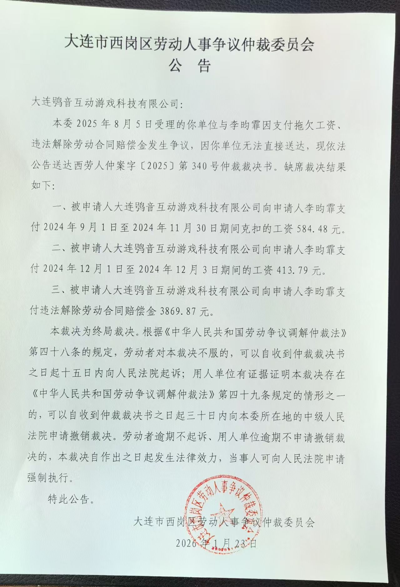本委2025年8月5日受理的你单位与李昀霏因支付拖欠工资、违法解除劳动合同赔偿金发生争议,因你单位无法直接送达,现依法公告送达西劳人仲案字〔2025〕第340号仲裁裁决书。缺席裁决结果如下: