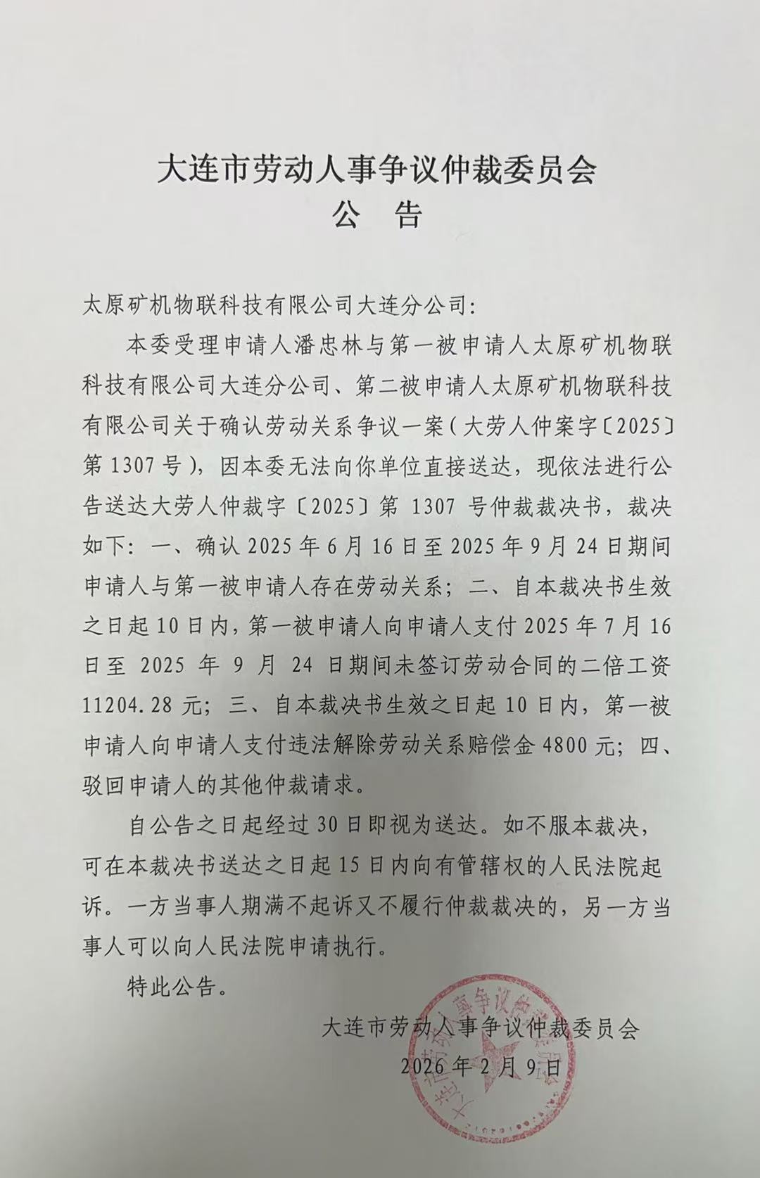 本委受理申请人潘忠林与第一被申请人太原矿机物联科技有限公司大连分公司、第二被申请人太原矿机物联科技有限公司关于确认劳动关系争议一案(大劳人仲案字〔2025〕第1307号),因本委无法向你单位直接送达,现依法进行公告送达大劳人仲裁字〔2025〕第1307号仲裁裁决书,裁决如下: