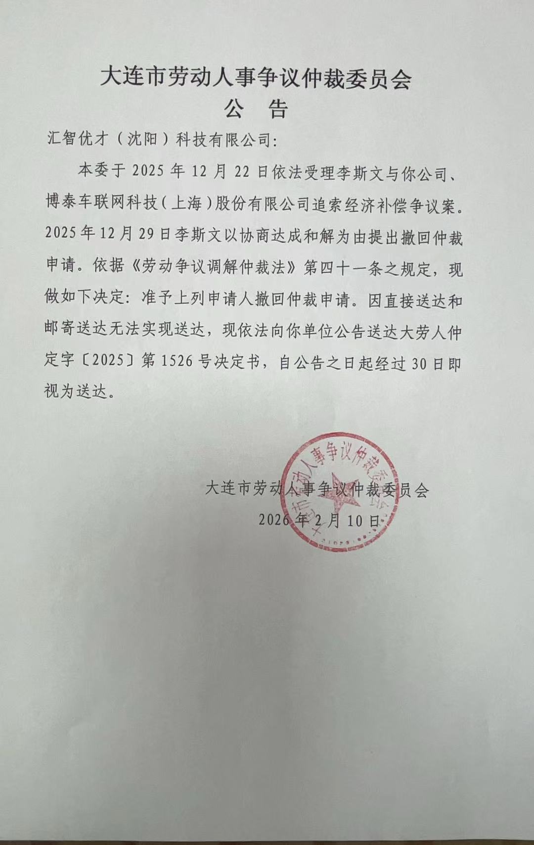 本委于2025年12月22日依法受理李斯文与你公司、博泰车联网科技(上海)股份有限公司追索经济补偿争议案。2025年12月29日李斯文以协商达成和解为由提出撤回仲裁申请。依据《劳动争议调解仲裁法》第四十一条之规定,现做如下决定: