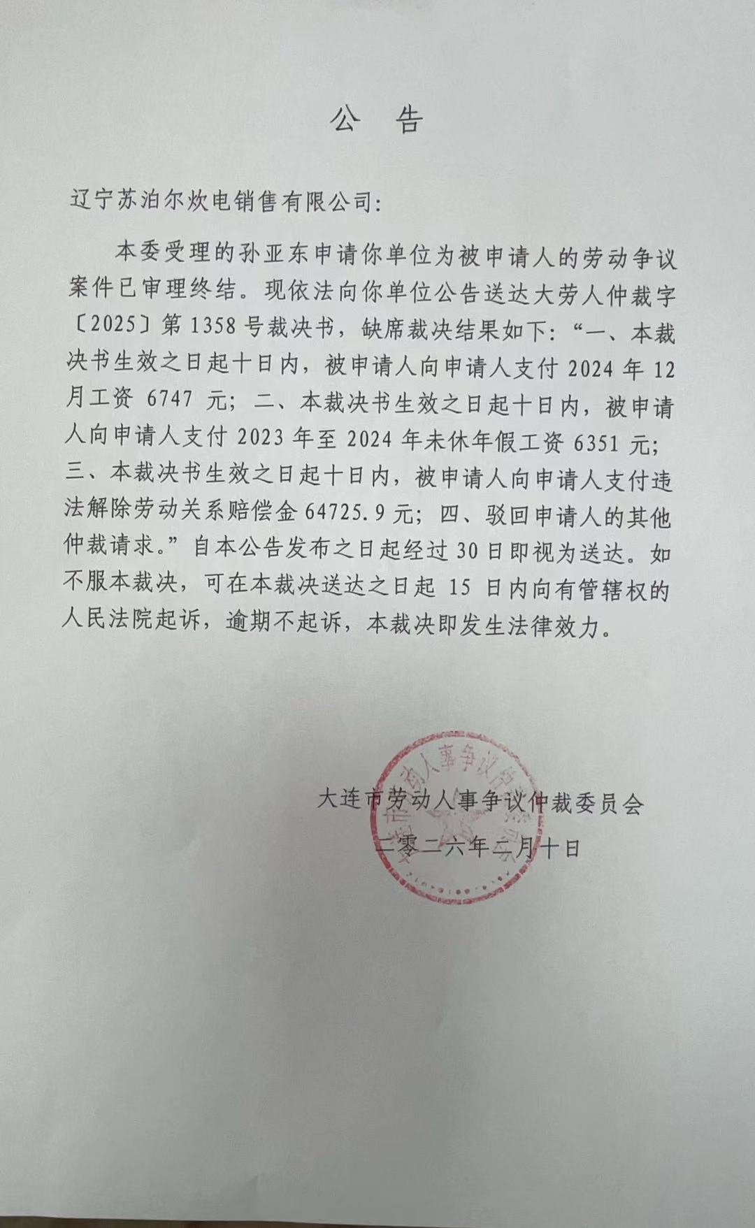 本委受理的孙亚东申请你单位为被申请人的劳动争议案件已审理终结。现依法向你单位公告送达大劳人仲裁字〔2025〕第1358号裁决书,缺席裁决结果如下: